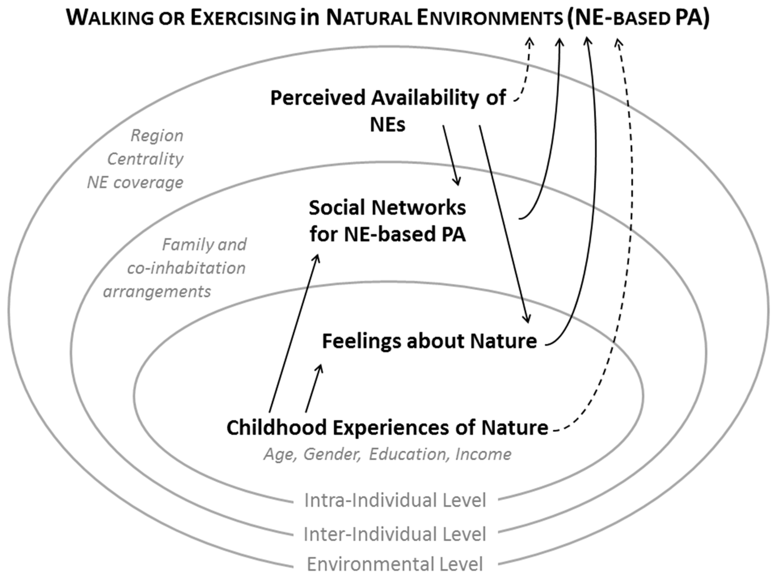 Inter-individuals factors may also play an important role within the NE-PA relation [6]. Whether a person choses to use NEs as an arena for PA would probably depend on social factors such as companionship and expected social benefits [25,26,32]. “Social interaction” was reported as another important motive for visiting NEs [29], whereas “lack of companionship” was an important reason not to visit them [25]. Some studies also indicate that nearby NEs can foster social interaction, providing opportunities to meet people and strengthening perceived social support and coherence [33,34]. More generally, the extent to which a personis integrated in a network of people who engage in NE-based PA, invite and accompany him or her, is likely to be an important factor influencing the use of available NEs for PA. This could also have a mediational effect in the NE-PA relation, with nearby NEs enhancing people’s social networks and in turn increasing the likelihood that a person would use the NEs for PA.
