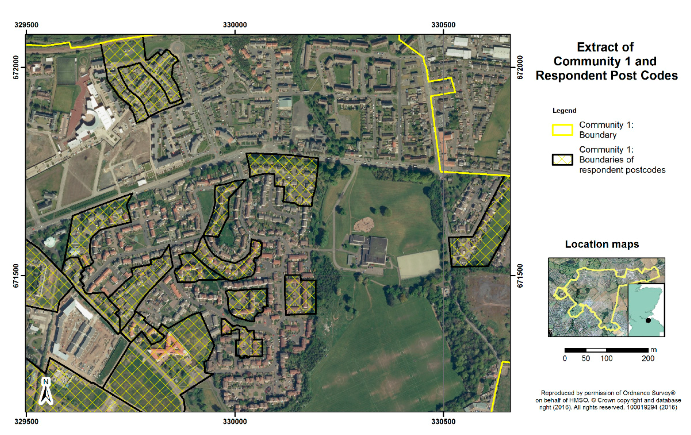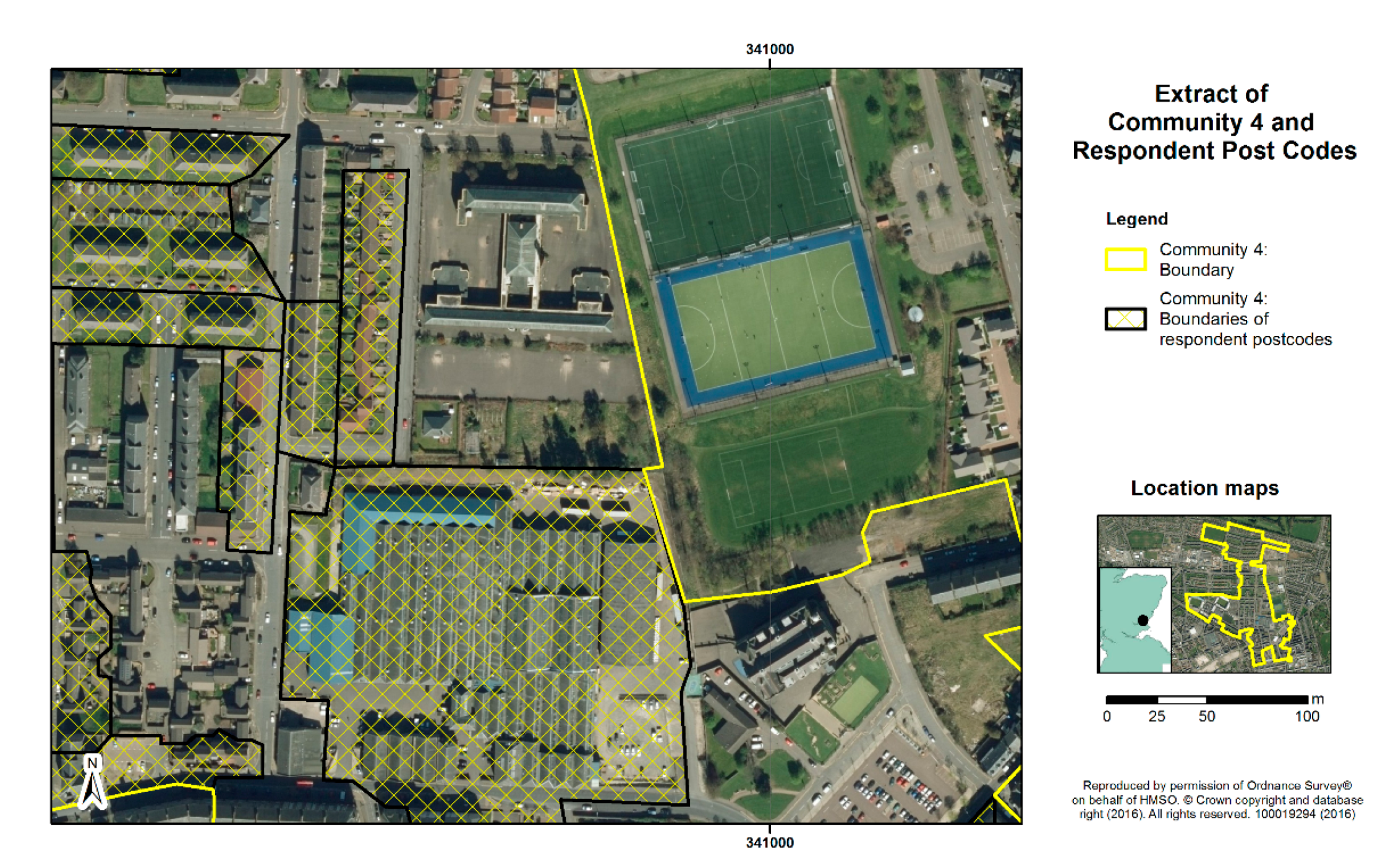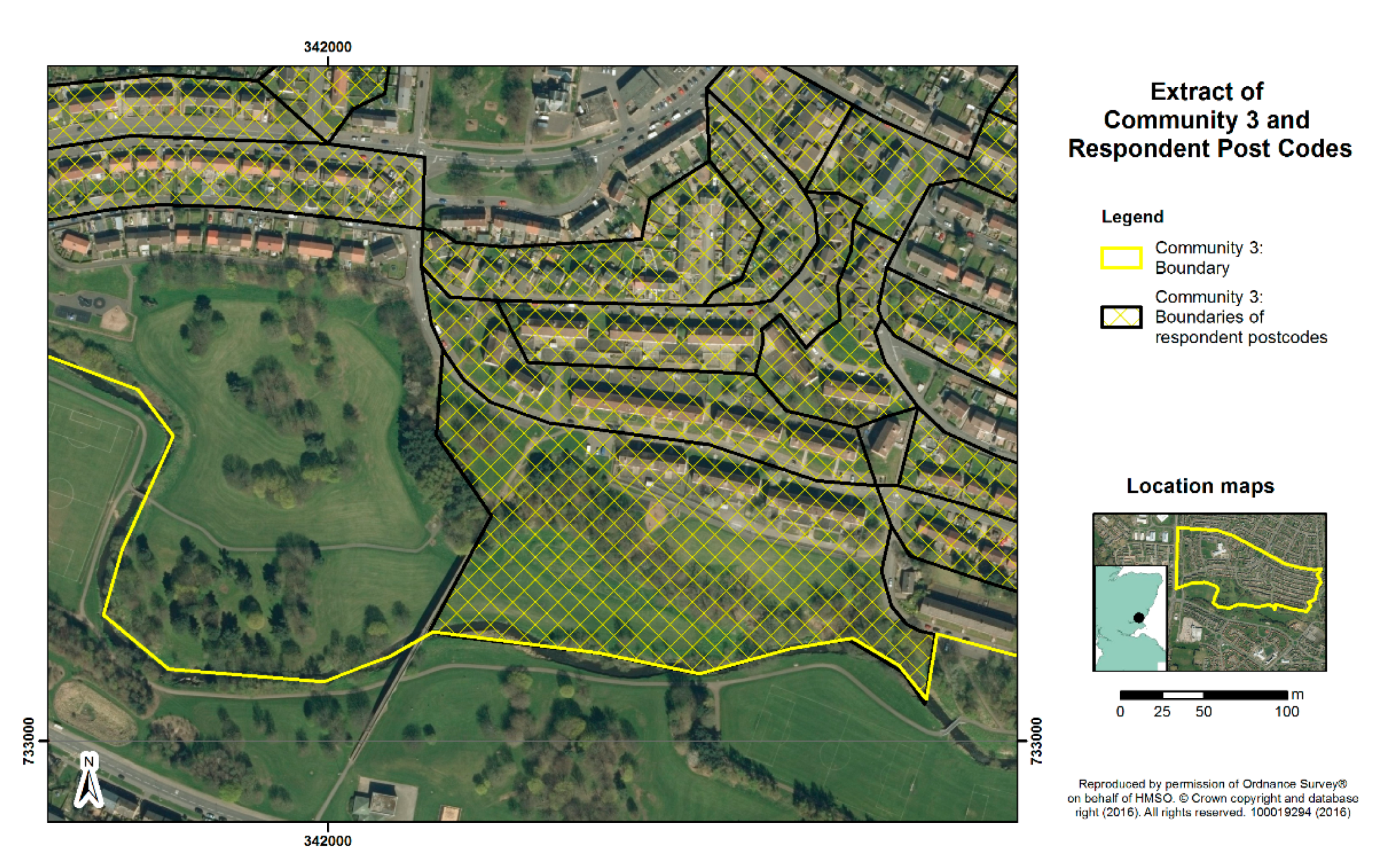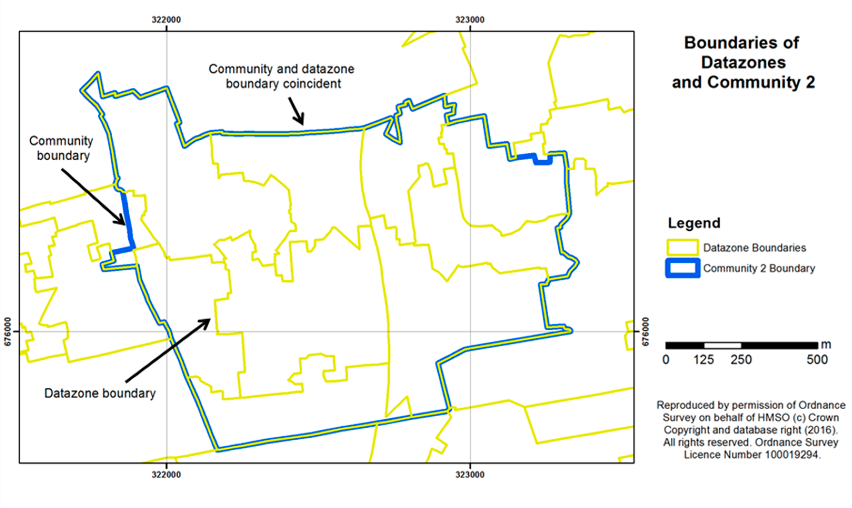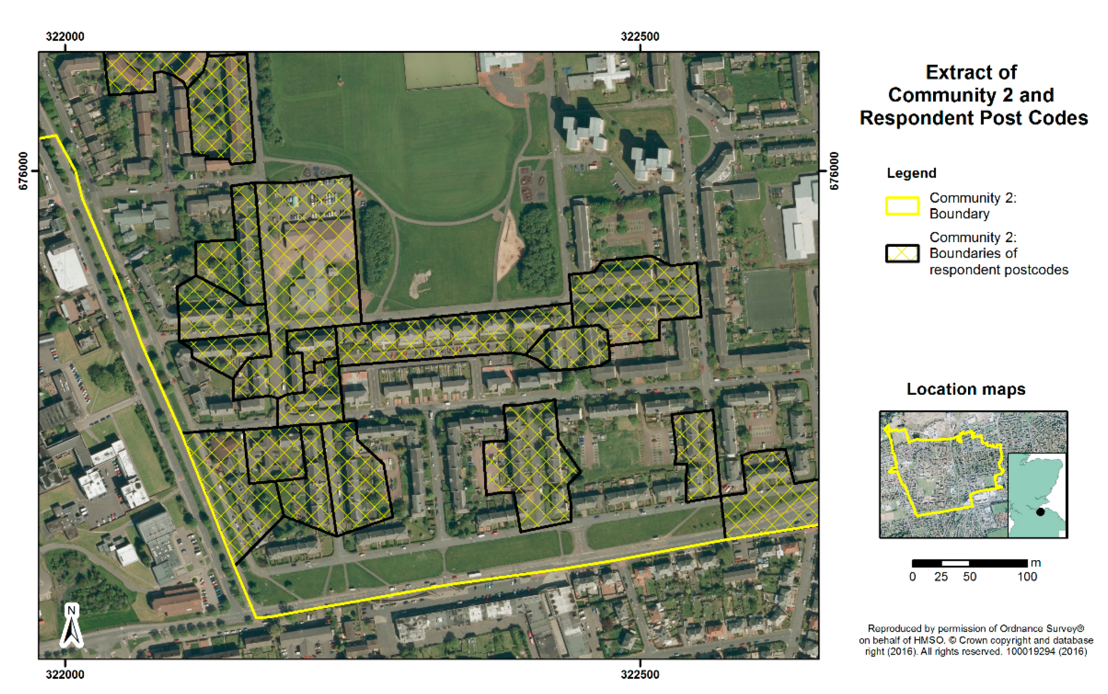 Community 2 outline showing boundaries of the datazones used for calculating the percentage area of green space per survey participant.