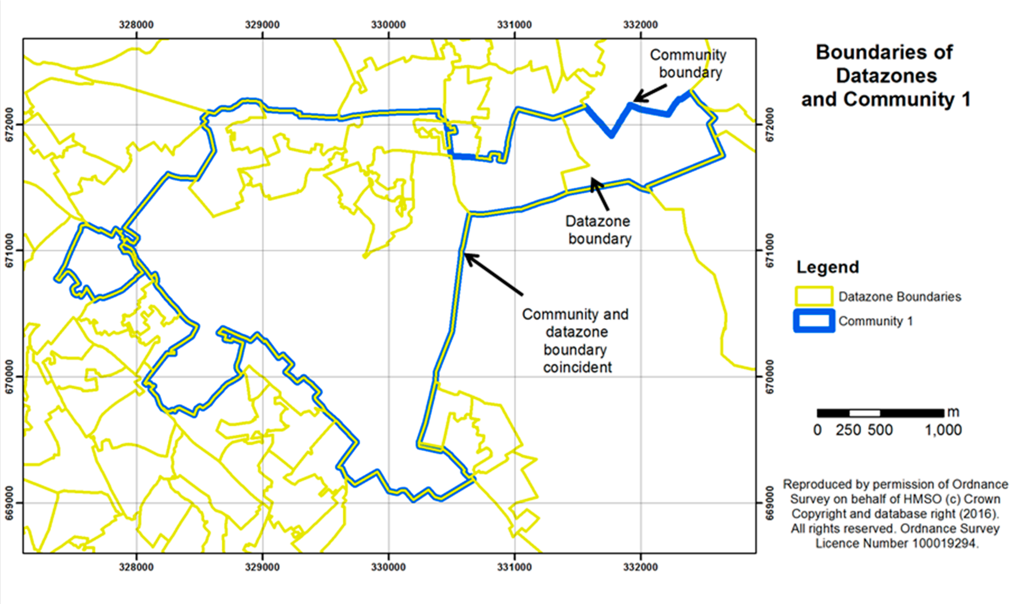 The study sites had initially been chosen as part of the wider GreenHealth project on the basis of the percentage area of public green space at census ward level. However, closer analysis of the data at a more detailed scale revealed considerable variation in quantities of green space around the living area of each participant, and different levels of access to gardens (some of which might be shared between residents of tenement blocks of flats/apartments but still private rather than public). It was recognised that the ward level data, i.e., the area of green space within census ward boundaries, was not detailed enough to take into account more local neighbourhood variations in housing layouts and green space patterns. A separate, comprehensive measure of green space was therefore developed at a finer scale, reported as a percentage of the area of the datazone within which each participant lived. Datazones were defined in Scotland in 2004 as a standardised unit for statistical reporting and contain a number of postcode areas but are smaller than the 2001 census wards. They have populations of between 500 and 1000 household residents, taking into account physical boundaries and natural communities so that, as far as possible, they contain households with similar social characteristics. Figure 5 and Figure 6 show examples of the datazone boundaries for Communities 1 and 2, indicating the zones within which green space levels were mapped for each community. The figures also indicate that the community boundaries from which our sample postcodes were taken (based on the 2001 census wards) do not always align exactly with the later-derived datazone boundaries. Nonetheless, for each participant we used the measure of percentage green space area in the datazone in which they resided, as this provided the finest available spatial resolution of green space.