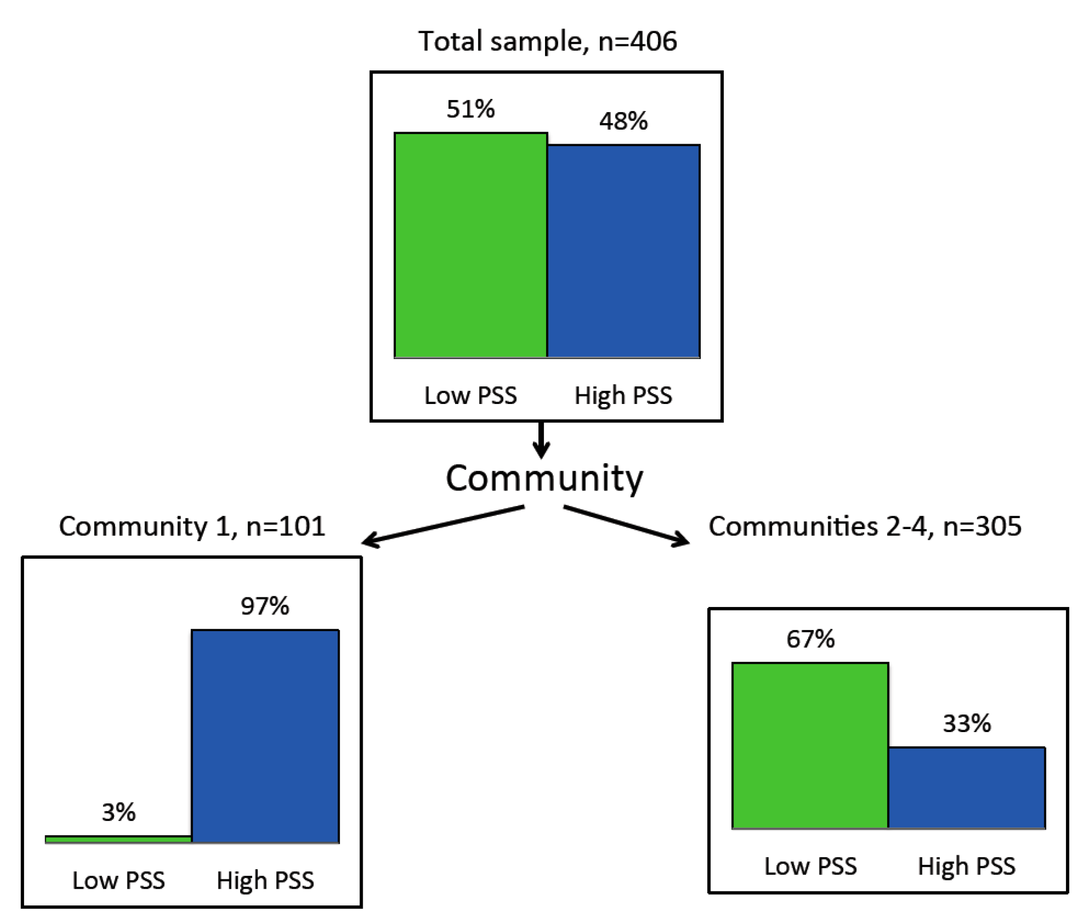 The results of CHAID applied to PSS as a dichotomised variable for the sample as a whole (n = 406) are shown in Figure 7. The top box shows an approximately even distribution of stress across the sample, with 51.2% in the lower stress group and 48.8% in the higher stress group (dichotomised around a median score of 15). In Community 1 (n = 101), 97.0% are in the higher stress group, while in Communities 2, 3 and 4 (n = 305), only 32.8% are in the higher stress group. The CHAID split is very highly significant (χ2 = 149.7, df = 1, p < 0.0001).