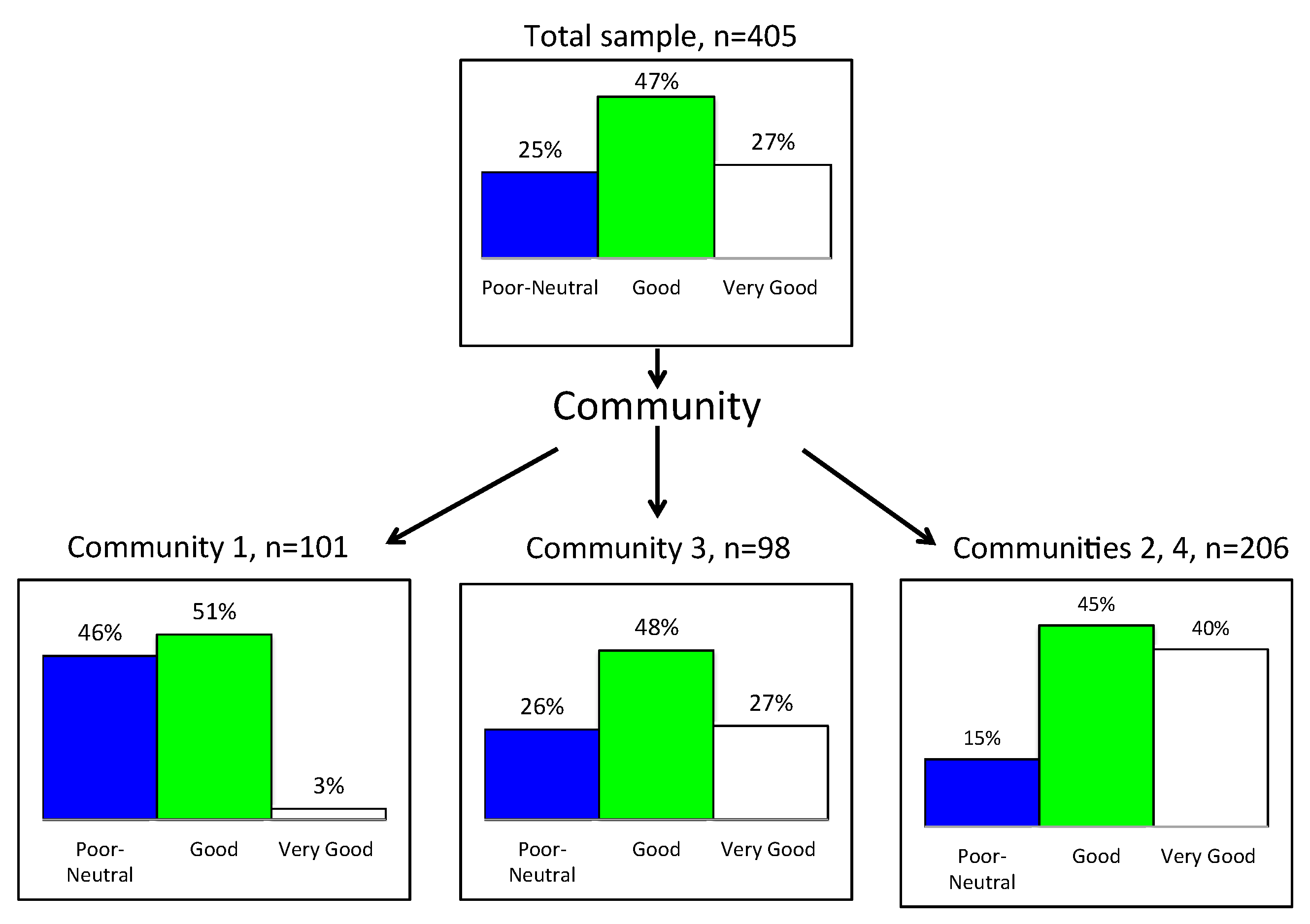 CHAID was applied to the general, self-report health measure as a three-category variable, distinguishing three groups: those with very poor, poor or “neither poor nor good” health (category 1) from those with good (category 2) or very good health (category 3) (see Figure 8). The top box shows that, overall, 25% of the sample did not have good health while 27% had very good health. Community 1 (n = 101) was the least healthy, with 46% of participants not in good health, while Community 3 (n = 98) had only 26% not in good health. The Communities reporting best health were 2 and 4 (n = 206), with only 15% not in good health and 40% in very good health. The CHAID χ2 = 56.98, df = 2, p < 0.0001.