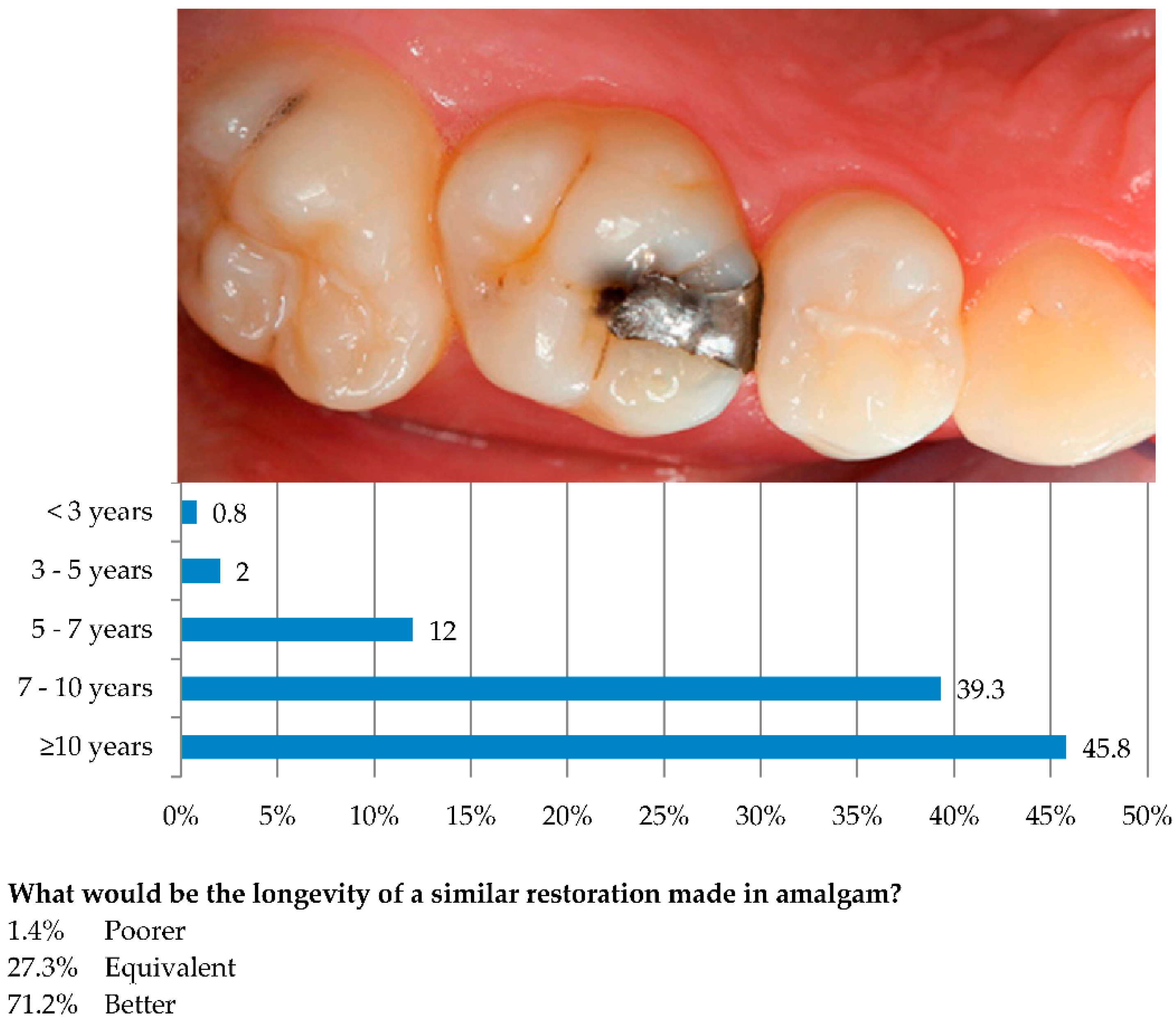 | Secondary caries | 0.1 | 1.8 | 25.4 | 70.6 | 2.1 | 2006 |