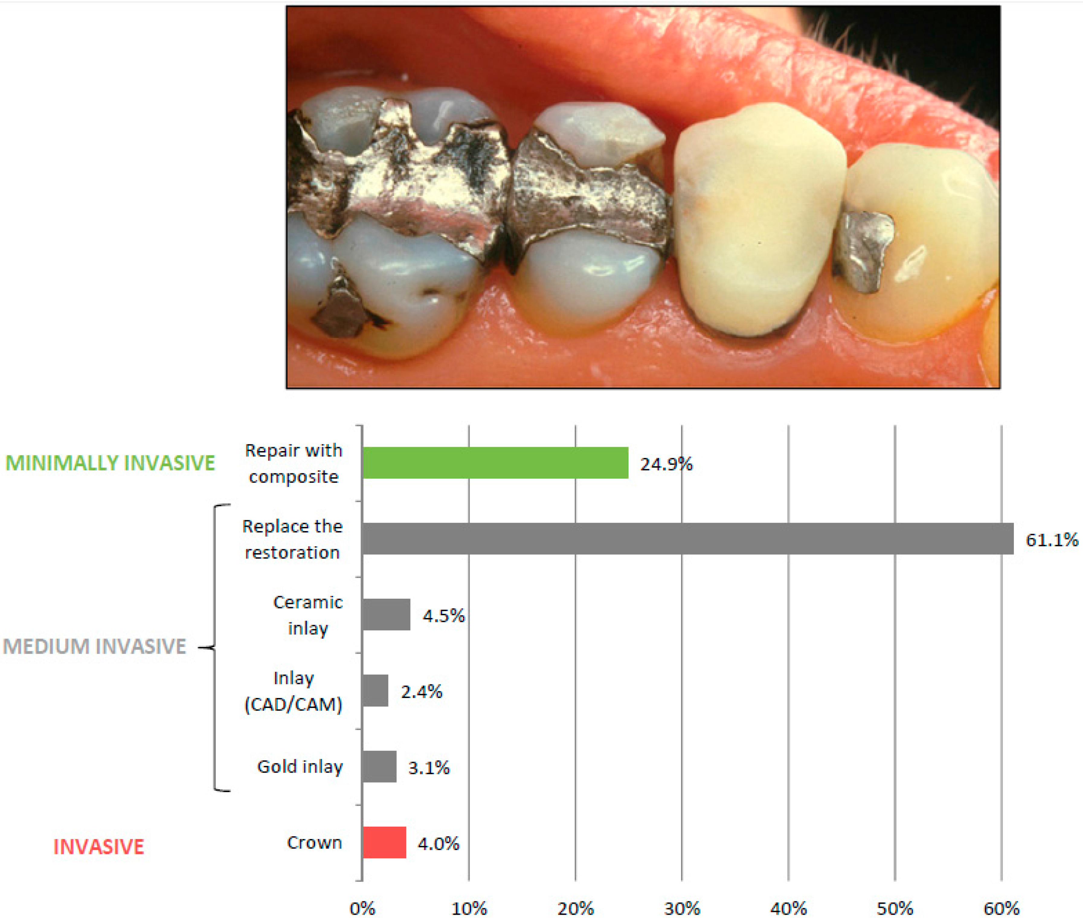| Medium invasive (restoration/inlay) (n = 1428) | 7.1% | 58.8% | 34.1% |