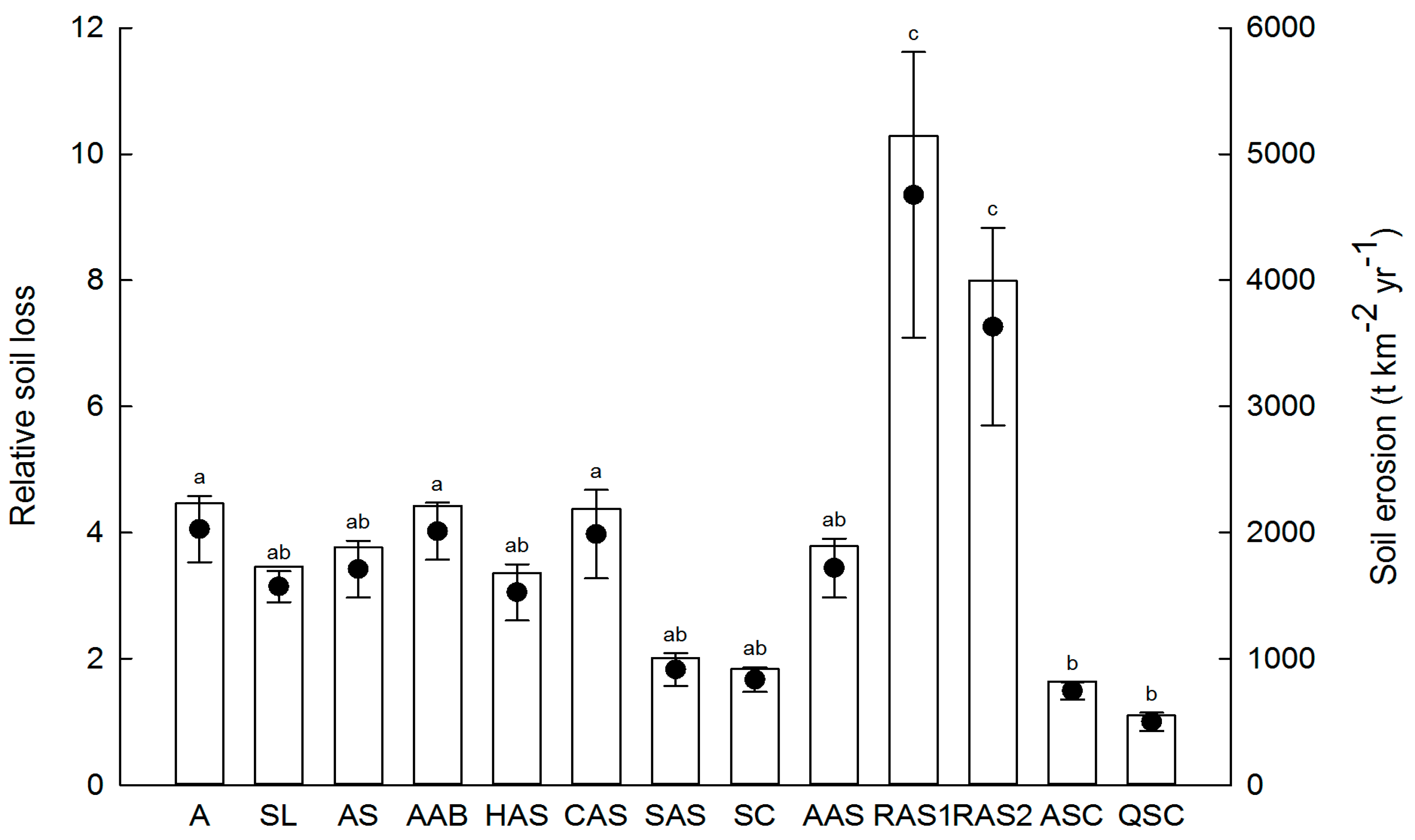 Soil erosion and relative soil loss in different plant communities under the extreme rainfall events during 2013. Vertical columns and black circles represent soil erosion and relative soil loss, respectively. Different lowercase letters indicate significance at p < 0.05 for relative soil loss between different plant communities. A: Artemisia scoparia (3–5 years); SL: S. bungeana + L. davurica (10–20 years); AS: A. gmelinii + S. bungeana (25–30 years); AAB: A. gmelinii + A. giralaii + B. ischaemum (30 years); HAS: H. rhamnoides − A. gmelinii + S. bungeana (15–20 years); CAS: C. intermedia − A. gmelinii + S. bungeana (15–20 years); SAS: S. viciifolia − A. gmelinii + S. bungeana (30–40 years); SC: S. julianae − C. lanceolata (30–40 years); AAS: A. sibirica − A. gmelinii + S. bungeana (15 years); RAS1: R. pseudoacacia − A. gmelinii + S. bungeana (6–8 years); RAS2: R. pseudoacacia − A. gmelinii + S. bungeana (15 years); ASC: A. buergerianum − S. julianae − C. lanceolata (40–50 years); QSC: Q. liaotungensis − S. julianae − C. lanceolata (60–70 years).