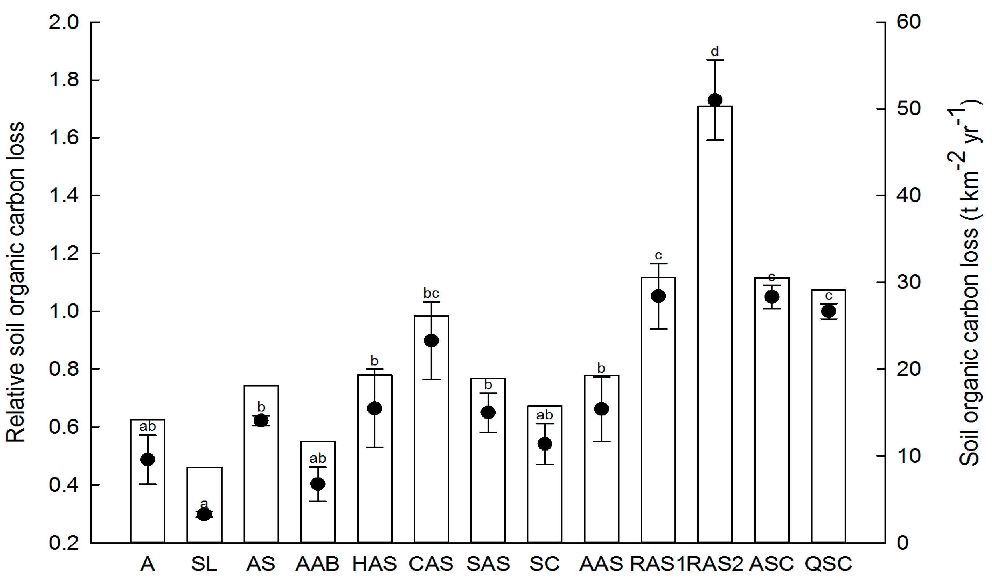 Soil organic carbon loss and relative soil organic carbon loss in different plant communities under extreme rainstorm events during 2013. Vertical columns and black circles represent soil organic carbon loss and relative soil organic carbon loss, respectively. Different lowercase letters indicate significance at p < 0.05 for relative soil organic carbon loss between different plant communities. A: Artemisia scoparia (3–5 years); SL: S. bungeana + L. davurica (10–20 years); AS: A. gmelinii + S. bungeana (25–30 years); AAB: A. gmelinii + A. giralaii + B. ischaemum (30 years); HAS: H. rhamnoides − A. gmelinii + S. bungeana (15–20 years); CAS: C. intermedia − A. gmelinii + S. bungeana (15–20 years); SAS: S. viciifolia − A. gmelinii + S. bungeana (30–40 years); SC: S. julianae − C. lanceolata (30–40 years); AAS: A. sibirica − A. gmelinii + S. bungeana (15 years); RAS1: R. pseudoacacia − A. gmelinii + S. bungeana (6–8 years); RAS2: R. pseudoacacia − A. gmelinii + S. bungeana (15 years); ASC: A. buergerianum − S. julianae − C. lanceolata (40–50 years); QSC: Q. liaotungensis − S. julianae − C. lanceolata (60–70 years).