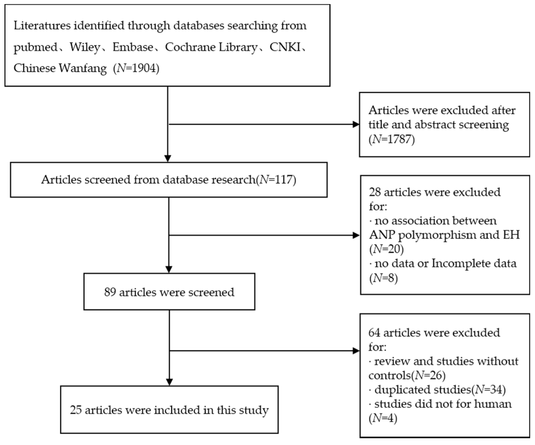 Atrial natriuretic peptide (ANP), which is also called atrial natriuretic factor (ANF), is a cardiac hormone that is synthesized and secreted in cardiac atrial [9,10,11]. The main physiological role of ANP is to make vascular smooth muscle diastolic and induce apoptosis in cultured cardiac myocytes; in addition, ANP can inhibit rennin-angiotensin-aldosterone and myocardial contractile activity [12,13]. ANP plays an important role in the regulation of blood pressure [14]. In order to provide evidence for the prevention of essential hypertension, many researchers have conducted a series of studies exploring the potential relationships between atrial natriuretic peptide (ANP) genetic polymorphism and essential hypertension [7,15,16]. According to existing studies, several candidate genes have been identified as risk factors of EH; the human ANP gene may be a possible candidate gene contributing to the risk of EH or other cardiovascular diseases [17,18]. Consequently, the current meta-analysis was conducted to examine whether the ANP polymorphisms are associated with patients with essential hypertension.