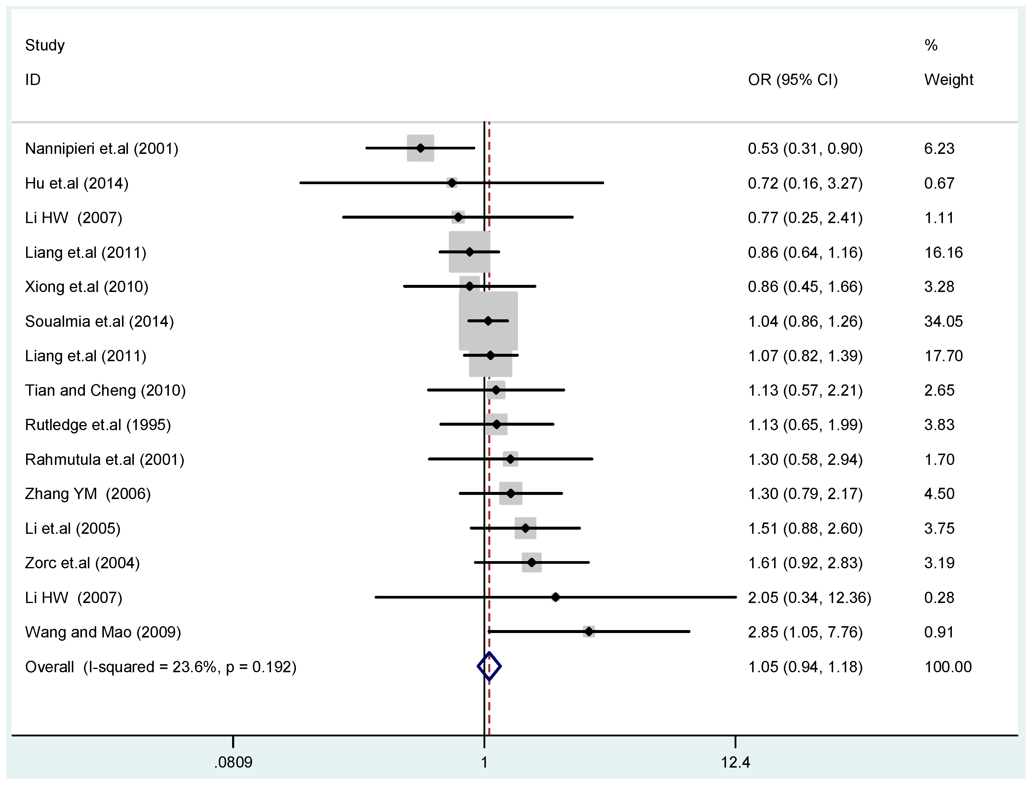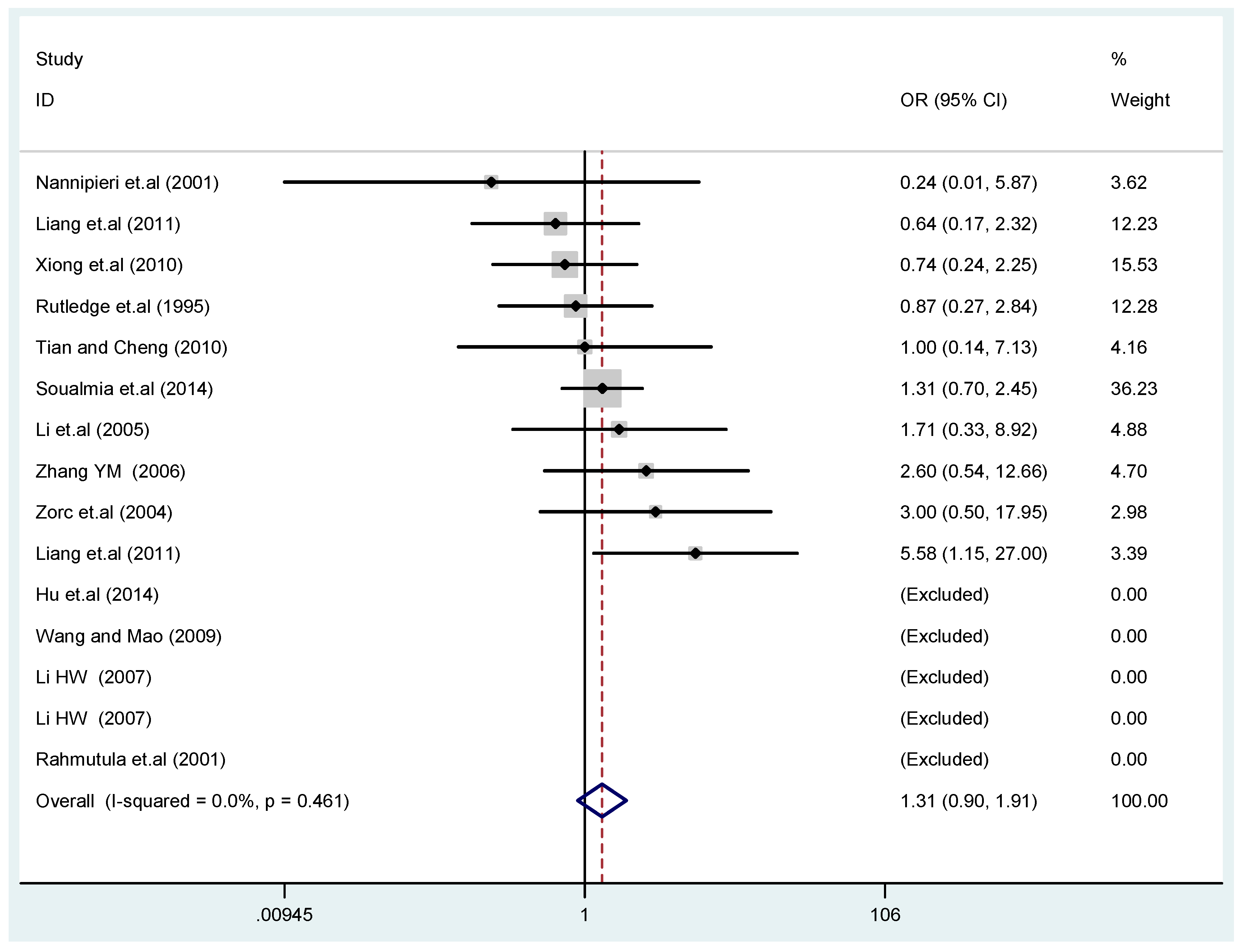 The following data were independently extracted by two reviewers, and disagreements between the two reviews were resolved through discussion until the reviewers reached a consensus. The data extraction included: the first author’s name, publication year, country, ethnicity, the number of cases and controls the sources of the subjects, genotyping methods, quality score, genotype distribution and allele frequency in cases and controls, and the Hardy-Weinberg equilibrium (HWE, p < 0.05 was considered a significant difference from HWE).