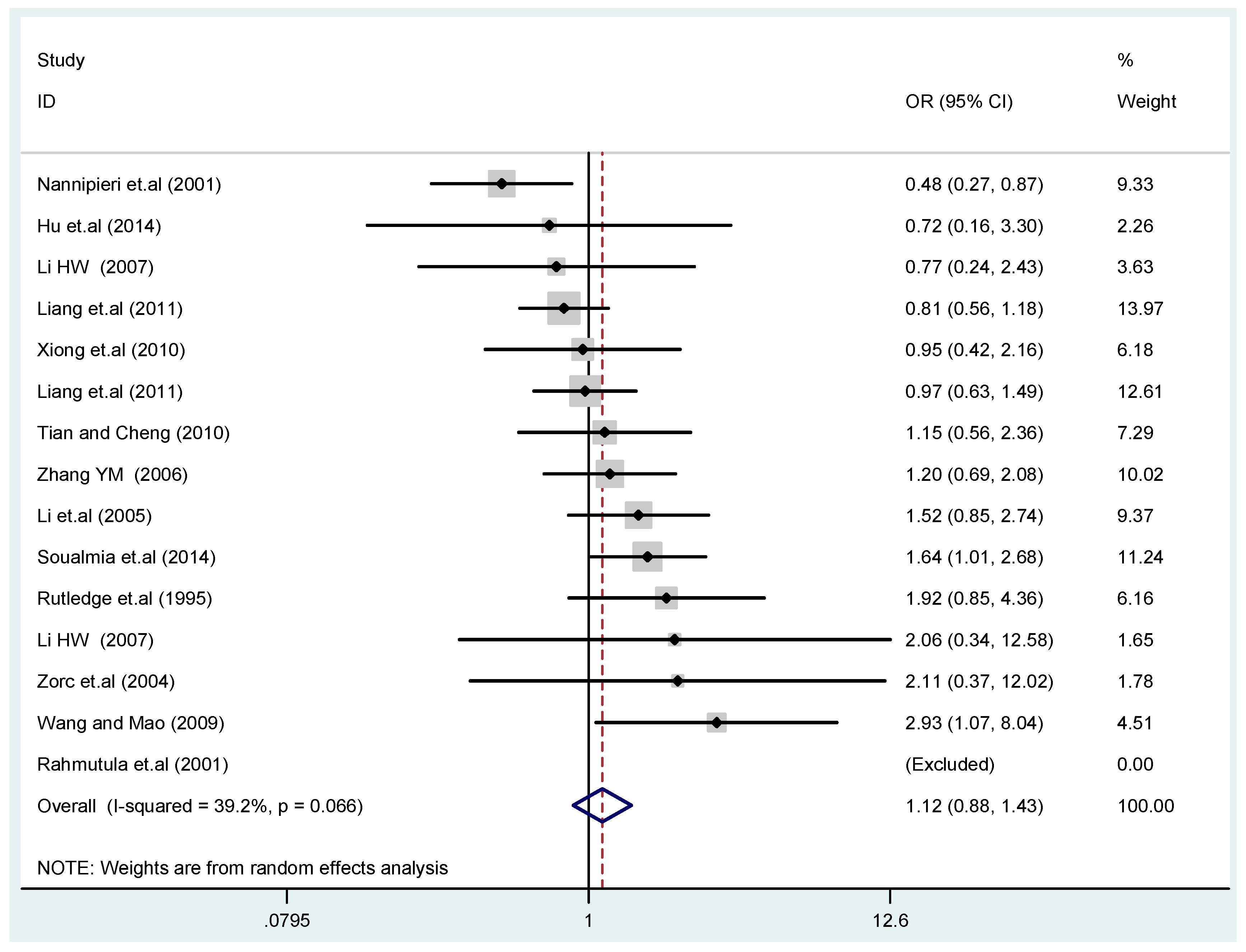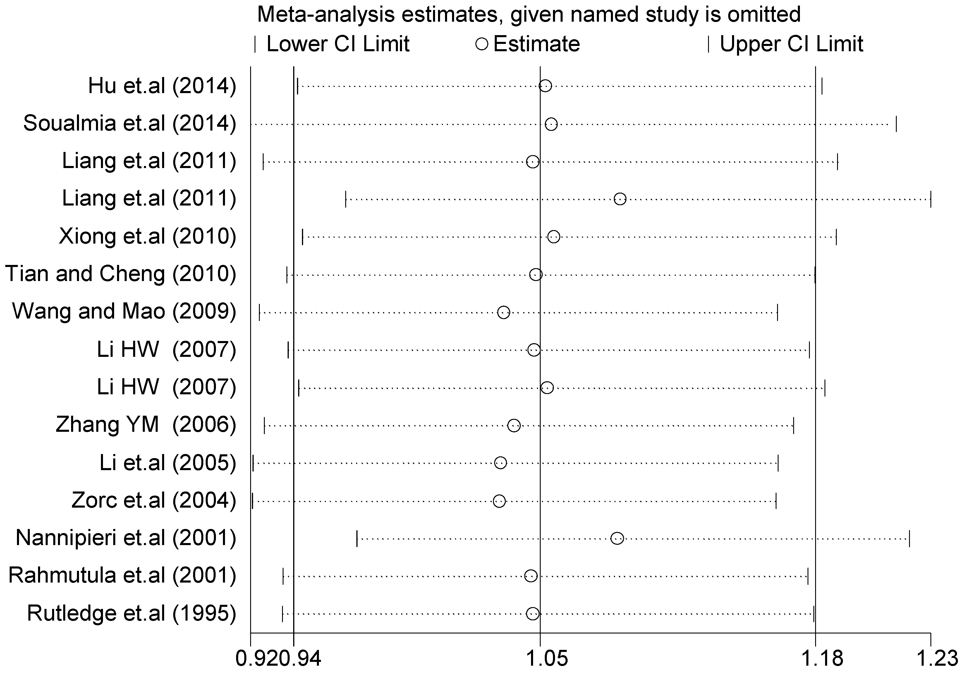 A sensitivity analysis was also conducted in the present study on three gene loci to evaluate the influence of each individual study on the pooled OR. The sensitivity analysis of the T2238C polymorphism showed that none of the fifteen studies included in this meta-analysis substantially influenced the combined results under all five genetic models. The forest plot of sensitivity analysis of the overall population of the T2238C polymorphism is shown in Figure 25. The sensitivity analysis of the G1837A polymorphism suggested that Rutledge [30] significantly influenced the combined results under all five genetic models; the tests for heterogeneity changed significantly if the study of Rutledge [30] was removed. The ethnicity of Rutledge [30] was Black, and the remaining five studies were all Asians, which indicated that the source of heterogeneity may be caused by ethnicity. Through sensitivity analysis of the T1766C polymorphism, the results become statistically significant under the genetic models of (TC vs. TT) and ((CC + TC) vs. TT) after excluding the study of Benedicta [35]. Therefore, the results of this study need to be interpreted carefully.