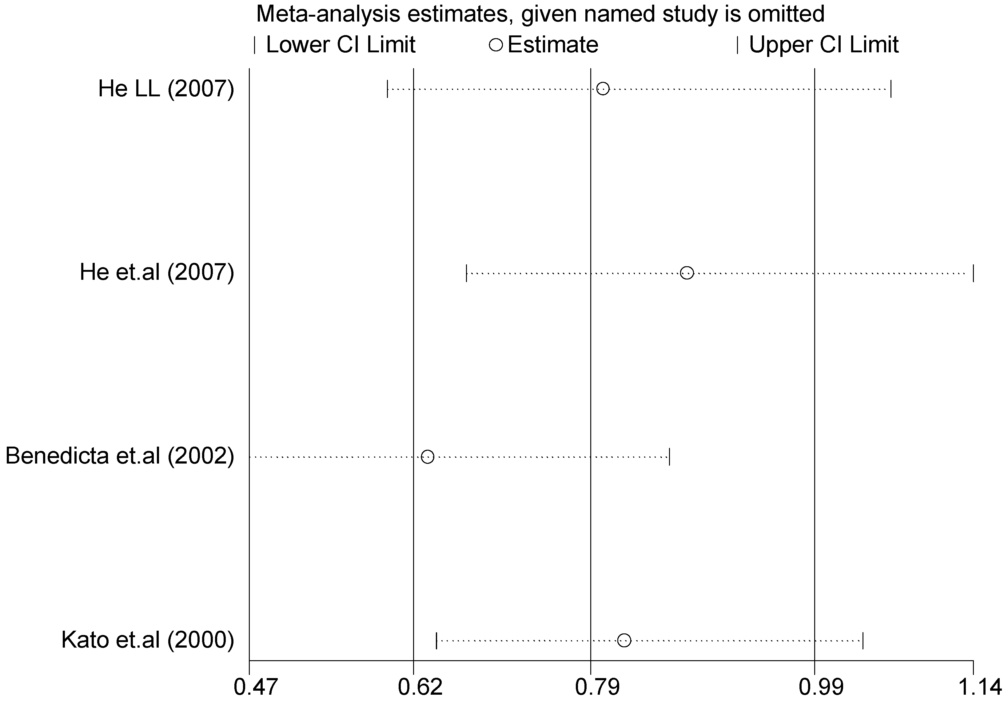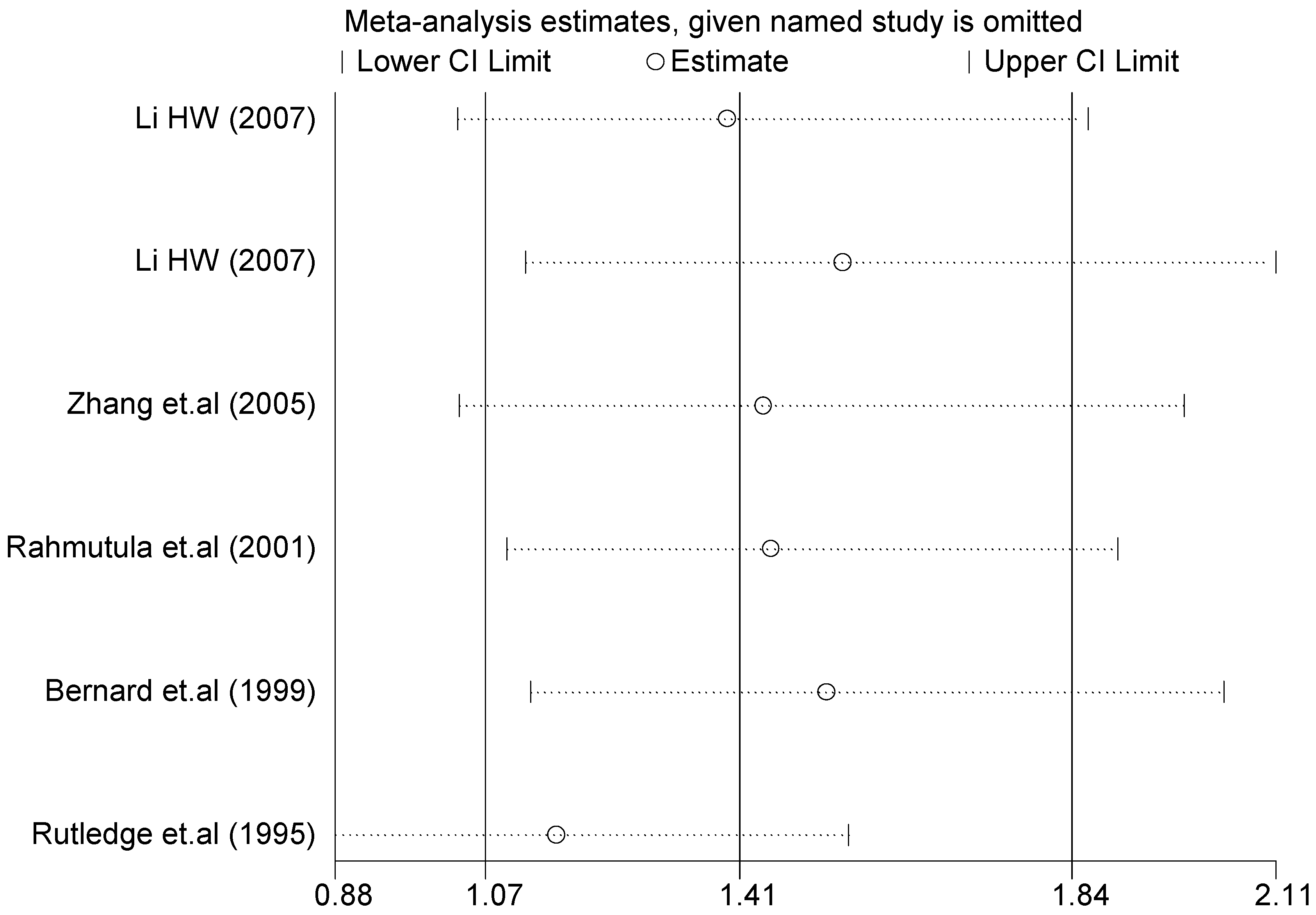A sensitivity analysis was performed on three gene loci to evaluate the influence of each individual study on the pooled OR. The sensitivity analysis of the T2238C polymorphism showed that none of the fifteen studies included in this meta-analysis dramatically influenced the combined results under all of the five genetic models. The sensitivity analysis of the G1837A polymorphism suggested that Rutledge [30] significantly influenced the combined results under all of the five genetic models; the tests for heterogeneity changed significantly if the study of Rutledge was removed. The results indicated that the source of heterogeneity may be caused by ethnicity, as shown in Table 4 and Table 6.
