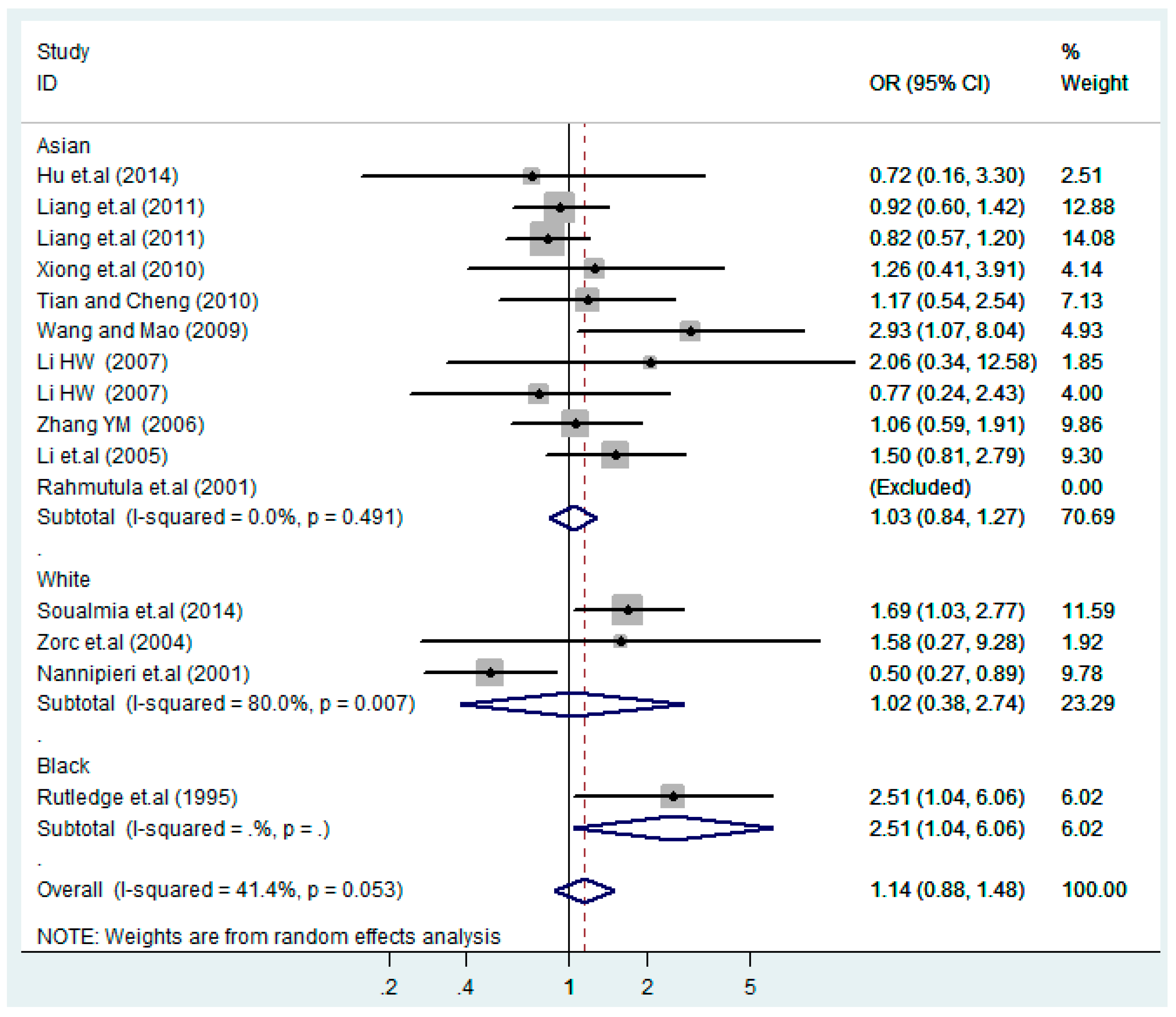 Ethnic subgroups analysis of T2238C additive model (C vs. T).