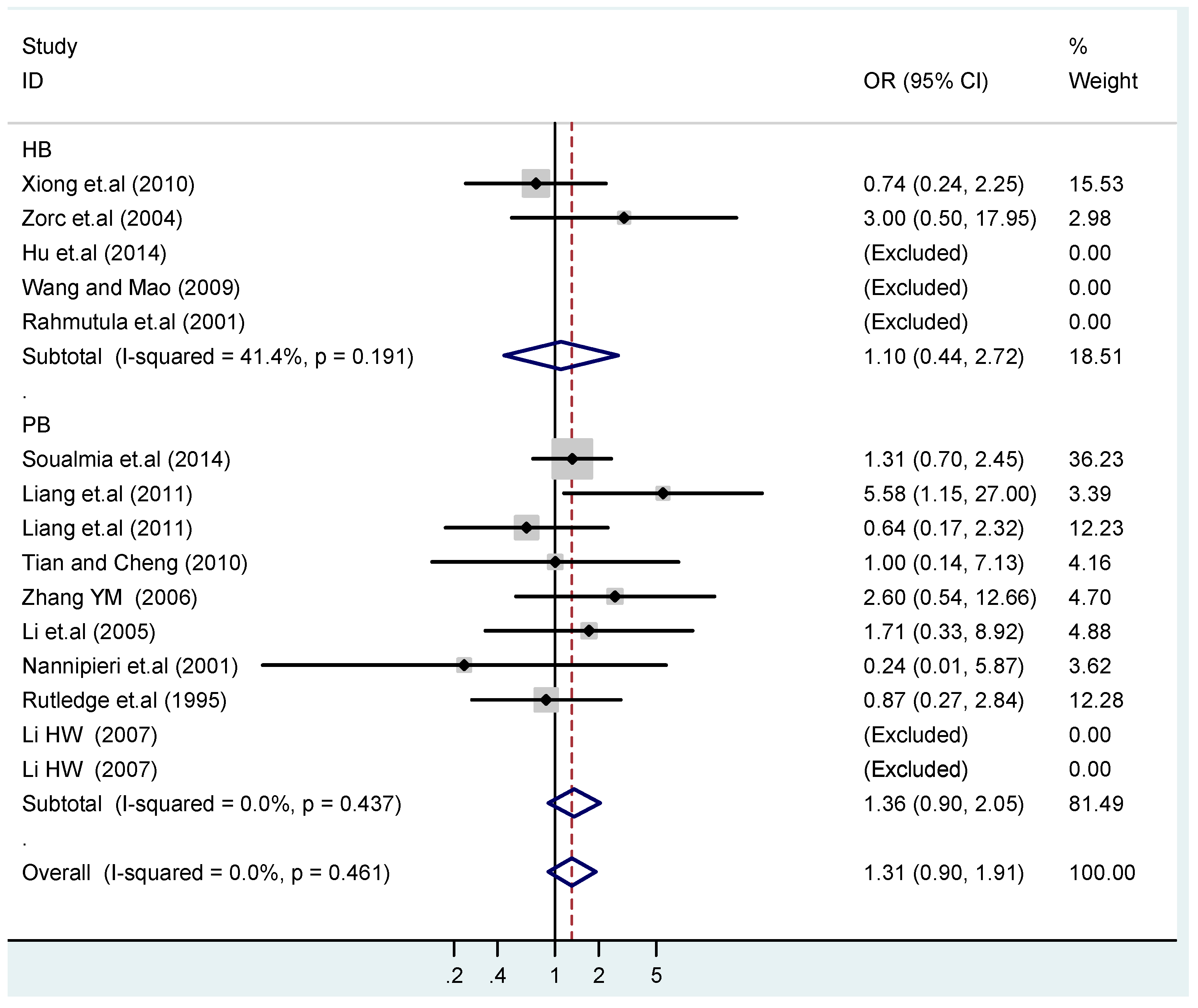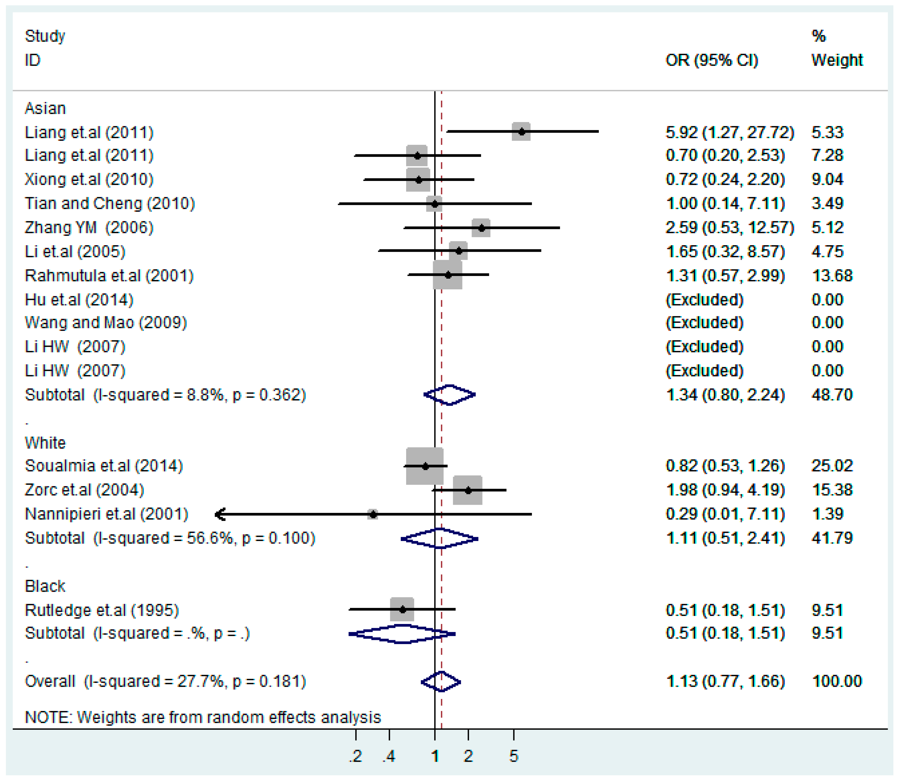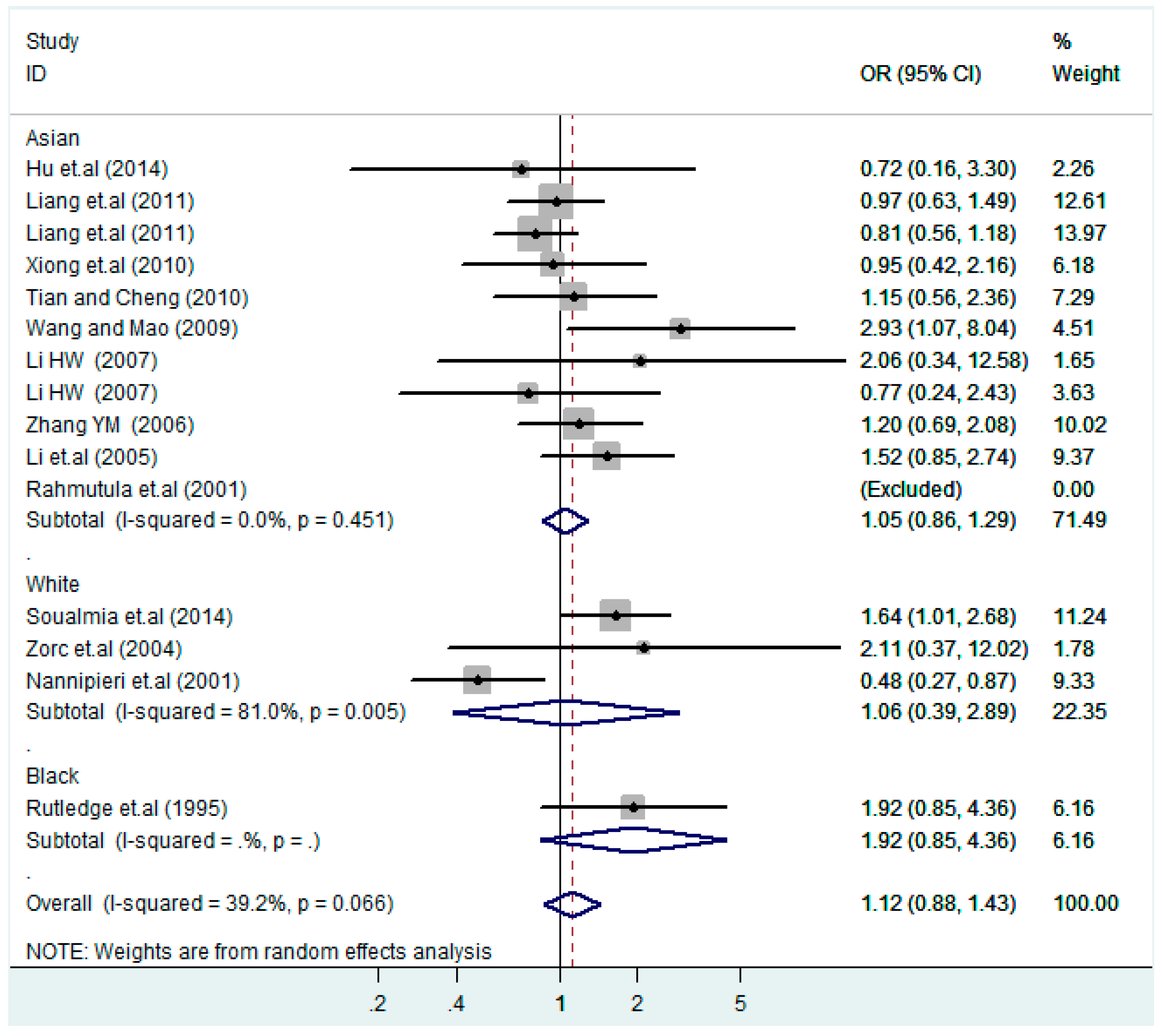 In the meta-analysis of Niu [38], the subgroup analysis of the T2238C polymorphism by study design presented opposite results for the HB and PB groups. However, in the subgroup analysis of this meta-analysis of the ANP T2238C polymorphism by the ethnicity of subjects, no obvious association was found in Asians, Whites and Blacks under the five genetic models in the overall population. Moreover, in the subgroup analysis of the ANP T2238C polymorphism by genotyping methods, no significant difference was found in PCR, PCR-RFLP, gene chips and Q-PCR under the five genetic models. Similarly, in the subgroup analysis of the ANP T2238C polymorphism by the source of controls, there was no apparent association between the T2238C polymorphism and EH in the (PB) population-based and (HB) hospital-based controls under the five genetic models. The forest plots in the subgroup analysis of the ANP T2238C polymorphism by the ethnicity of subjects, genotyping methods and the source of controls under the five genetic models were presented in Figure 9, Figure 10, Figure 11, Figure 12, Figure 13, Figure 14, Figure 15, Figure 16, Figure 17, Figure 18, Figure 19, Figure 20, Figure 21, Figure 22 and Figure 23.