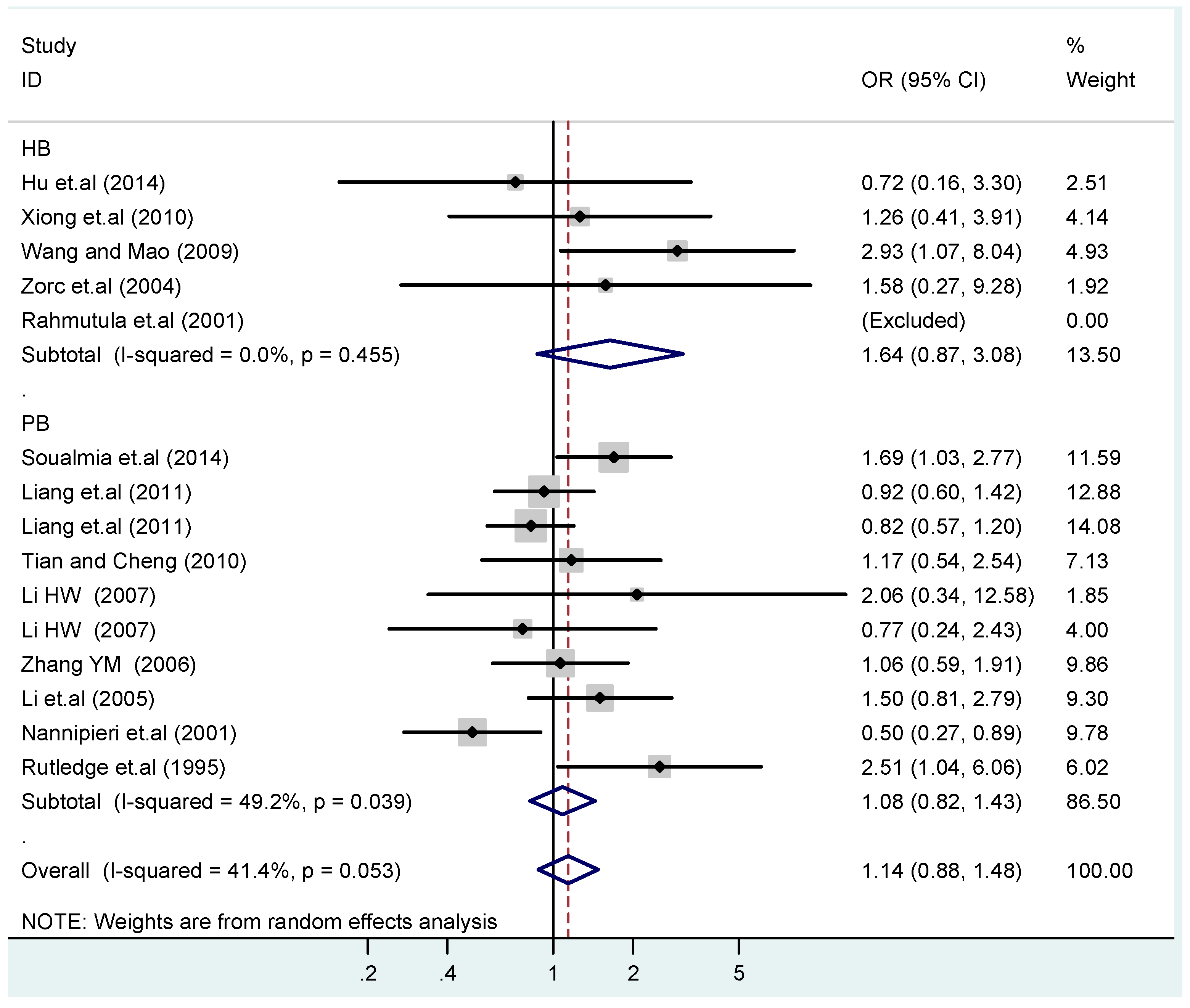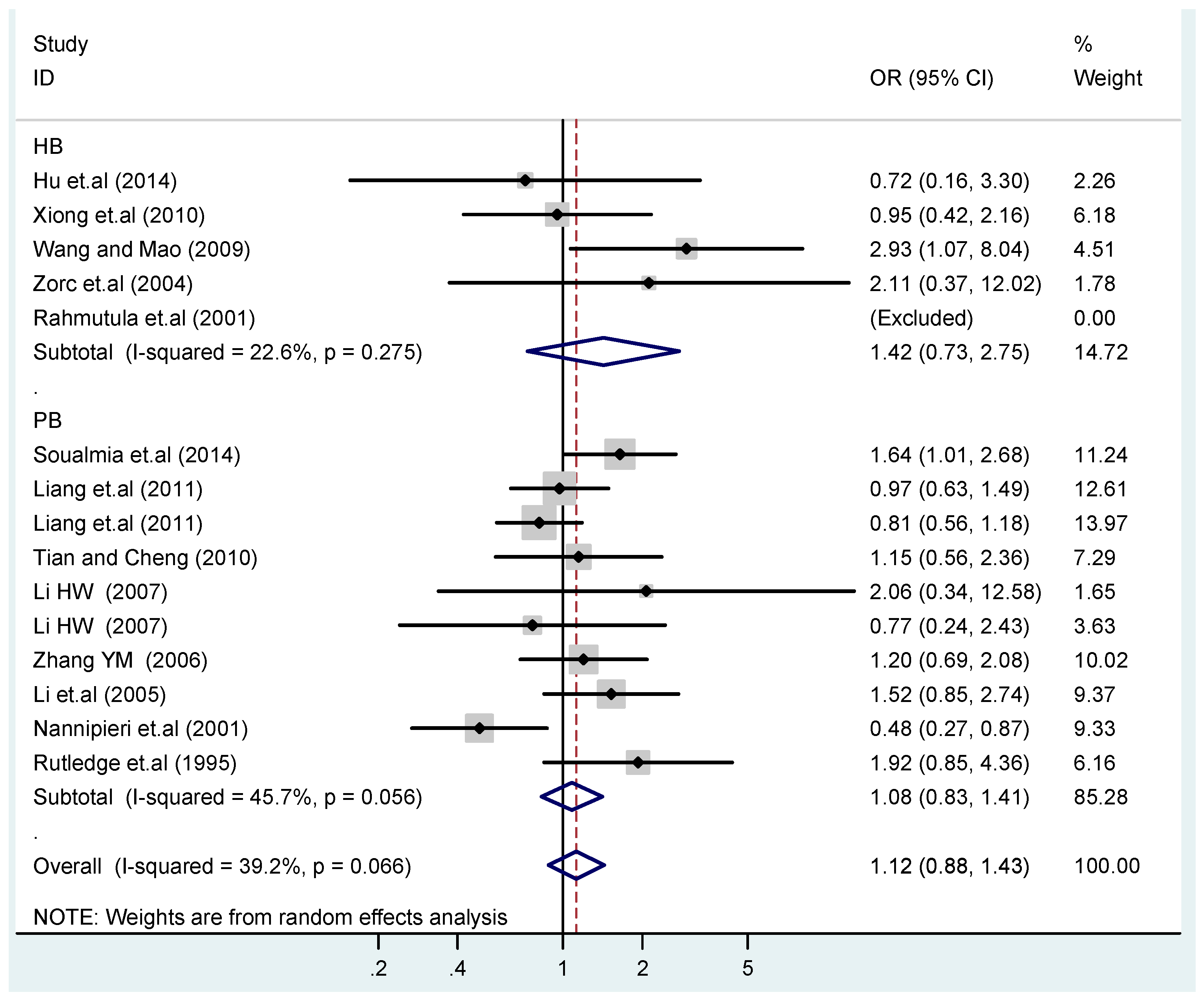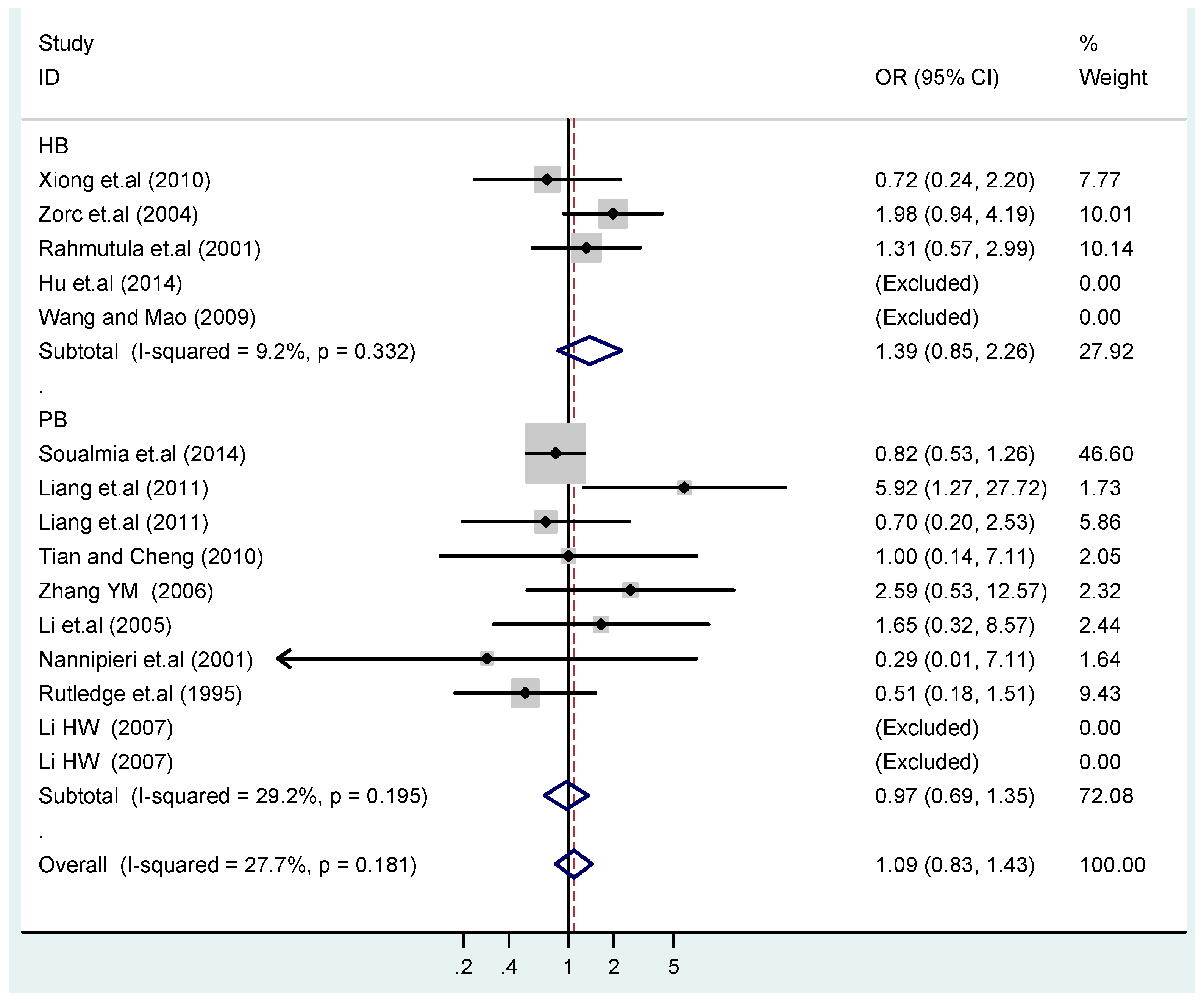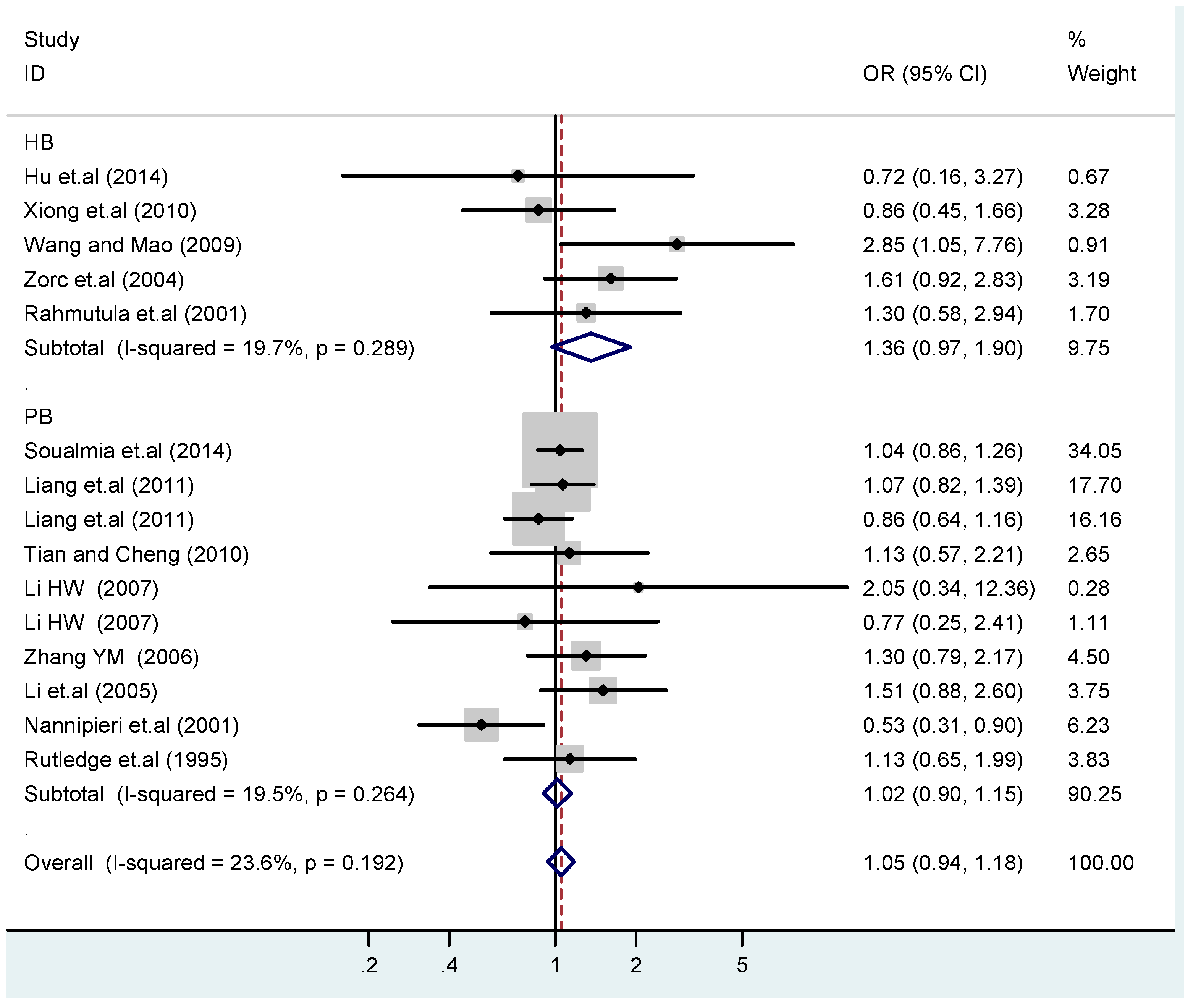 In the meta-analysis of Niu [38], the subgroup analysis of the T2238C polymorphism by study design presented opposite results for the HB and PB groups. However, in the subgroup analysis of this meta-analysis of the ANP T2238C polymorphism by the ethnicity of subjects, no obvious association was found in Asians, Whites and Blacks under the five genetic models in the overall population. Moreover, in the subgroup analysis of the ANP T2238C polymorphism by genotyping methods, no significant difference was found in PCR, PCR-RFLP, gene chips and Q-PCR under the five genetic models. Similarly, in the subgroup analysis of the ANP T2238C polymorphism by the source of controls, there was no apparent association between the T2238C polymorphism and EH in the (PB) population-based and (HB) hospital-based controls under the five genetic models. The forest plots in the subgroup analysis of the ANP T2238C polymorphism by the ethnicity of subjects, genotyping methods and the source of controls under the five genetic models were presented in Figure 9, Figure 10, Figure 11, Figure 12, Figure 13, Figure 14, Figure 15, Figure 16, Figure 17, Figure 18, Figure 19, Figure 20, Figure 21, Figure 22 and Figure 23.