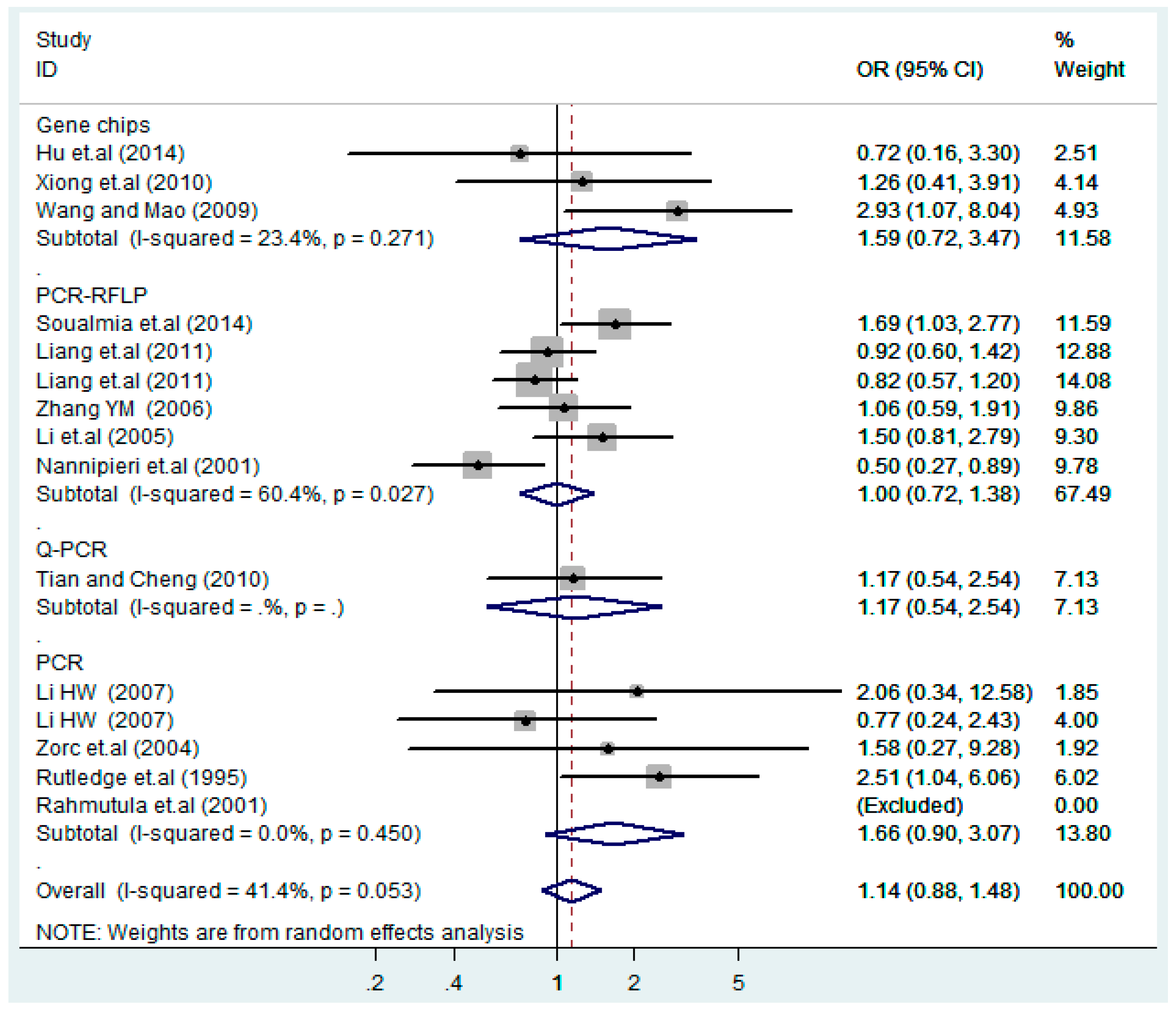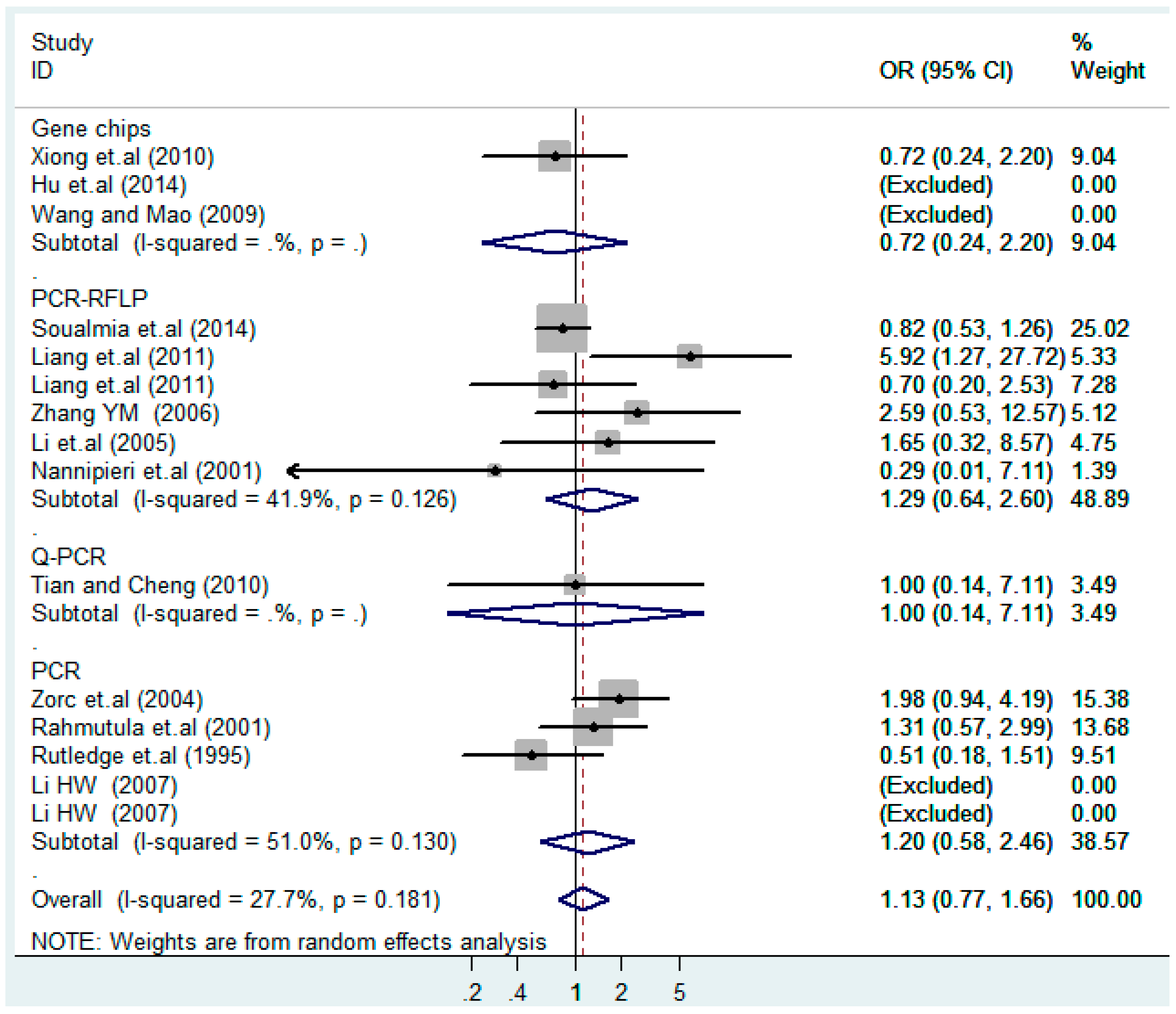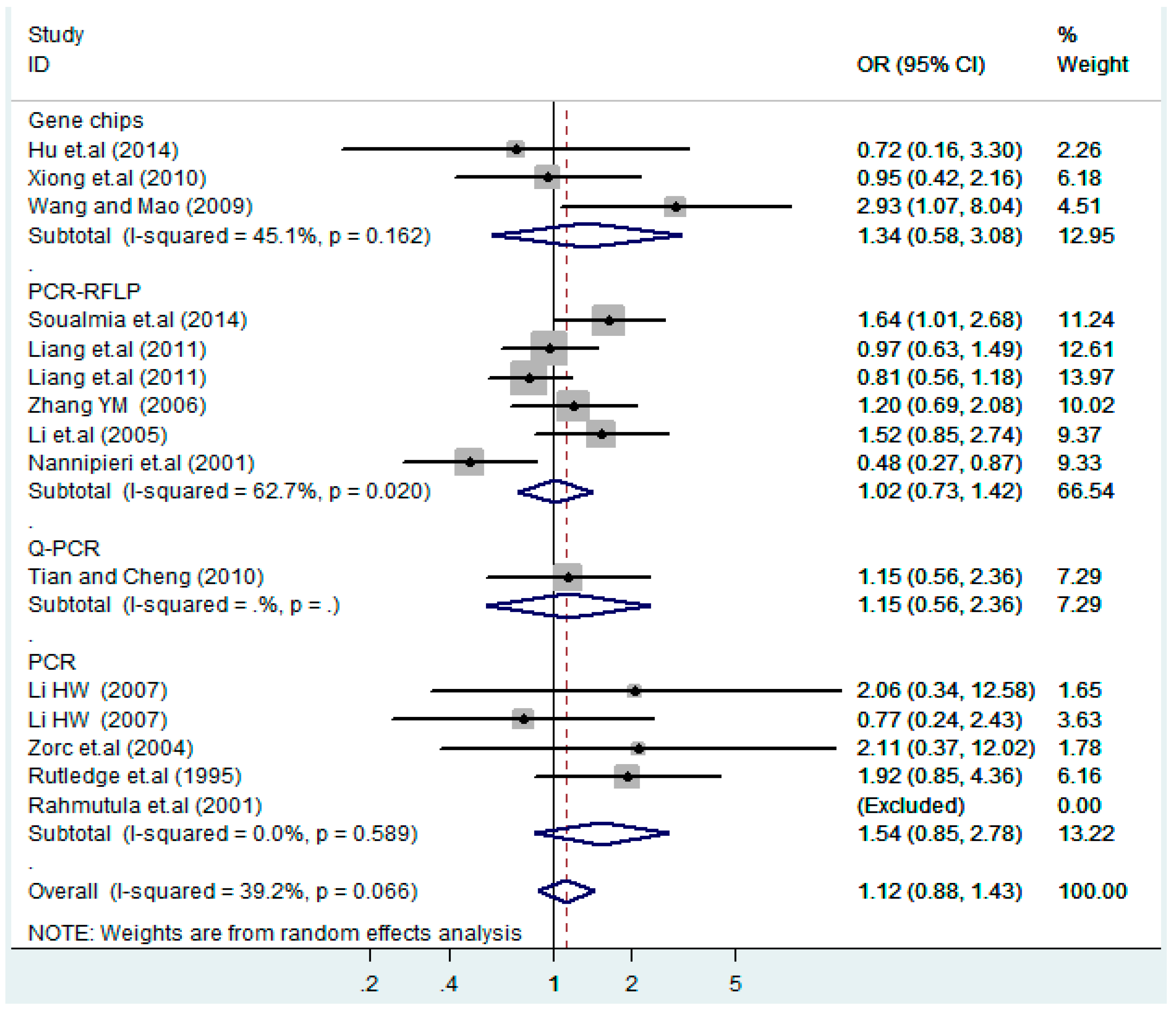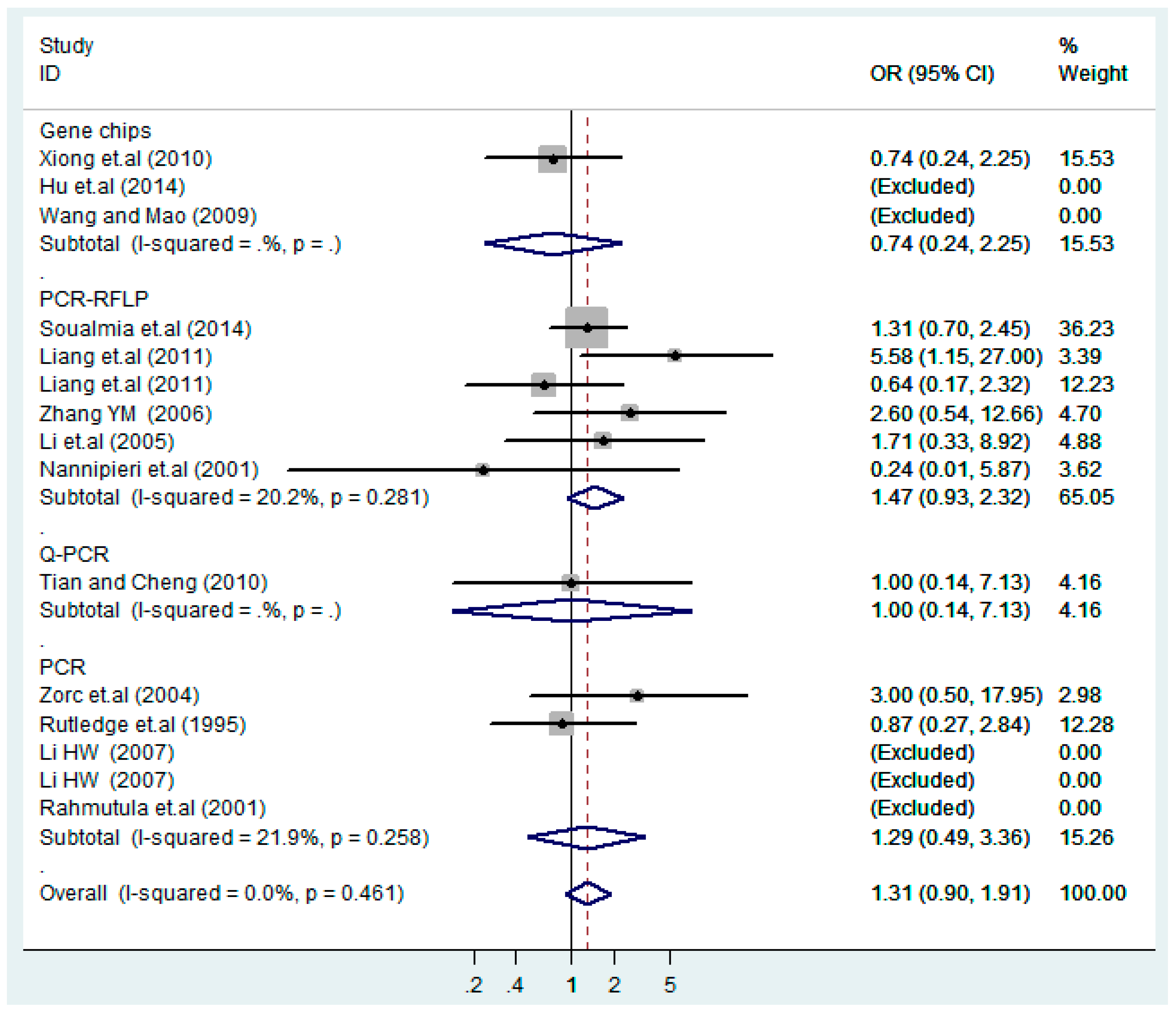 Subgroups of genotyping methods of T2238C additive model (C vs. T).