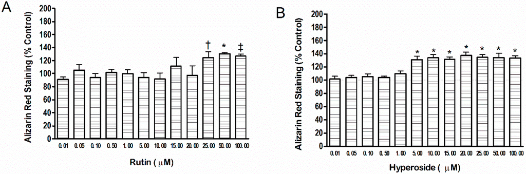 Mineral content produced by addition of (A) rutin or (B) hyperoside. Mineral content was measured by alizarin red staining. Significant differences are indicated by: † p < 0.05, ‡ p < 0.01, * p < 0.001 compared to control. Each bar represents n = 6.