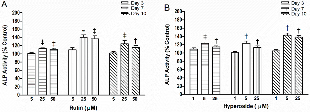 Alkaline phosphatase activity (ALP) activity with addition of (A) rutin or (B) hyperoside. Activity was measured by the rate of hydrolysis of p-nitrophenyl phosphate. Significant differences are indicated by: † p < 0.05, ‡ p < 0.01, * p < 0.001 compared to control within a day. Each bar represents n = 6.