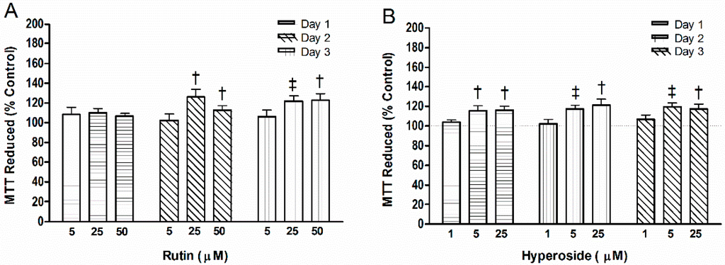 3-(4,5-dimethyl-2-thiazolyl)-2,5-diphenyl-2H-tetrazolium bromide (MTT) levels reduced with addition of (A) rutin or (B) hyperoside. Activity was measured by the reduction of MTT. Significant differences are indicated by: † p < 0.05 and ‡ p < 0.01 compared to control within a day. Each bar represents n = 6.
