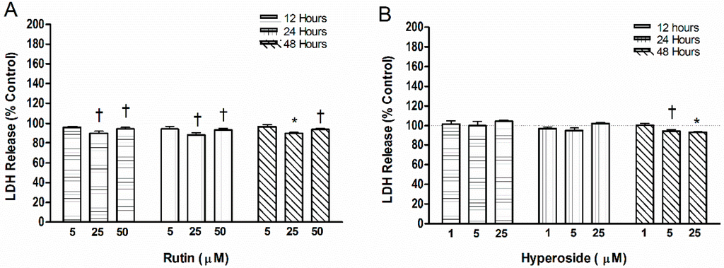 Lactate dehydrogenase (LDH) release by addition of (A) rutin or (B) hyperoside. LDH activity was measured by the reduction of NAD+ to aid in the conversion of a tetrazolium dye to a formazan crystal. Significant differences are indicated by: † p < 0.05, and * p < 0.001 compared to control within a day. Each bar represents n = 6.