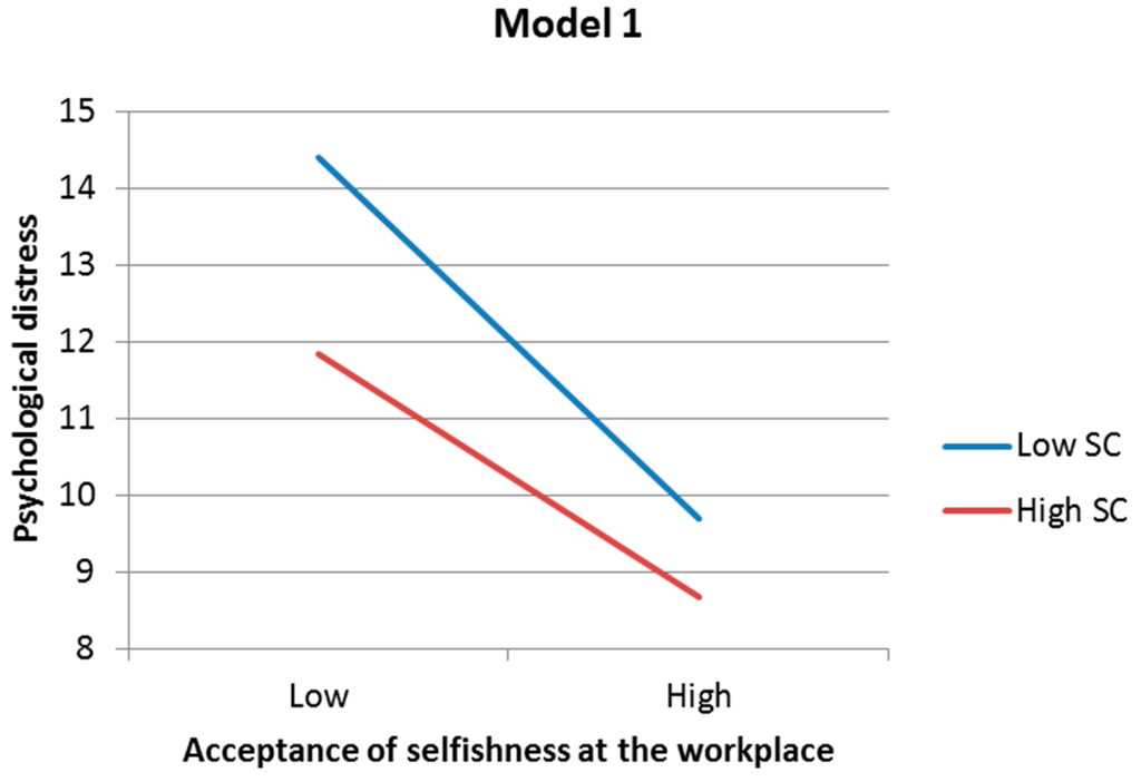 Regression lines and predicted values illustrating significant interaction effects of acceptance of selfishness at the workplace and sense of contribution on psychological distress in models 1 and 2. SC = sense of contribution.