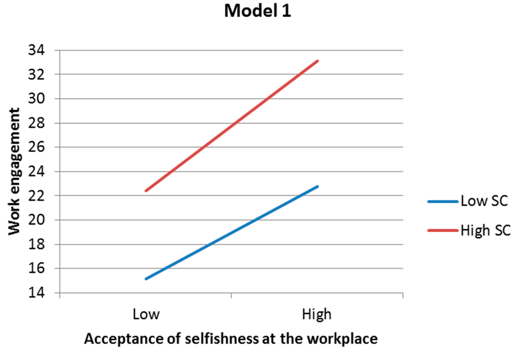 Regression lines and predicted values illustrating significant interaction effects of acceptance of selfishness at the workplace and sense of contribution on work engagement in models 1 and 2. SC = sense of contribution.