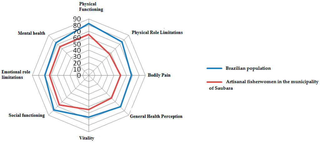 Figure 1 represents a comparison of domain values from SF-36v01 of the artisanal fisherwomen/shellfish gatherers in relation to normative reference values of the Brazilian population highlighted in other scientific studies. According to the polar graph representation, it is clear that these workers from Saubara had, in all areas, lower scores when compared to the results of the Brazilian population, according to Laguardia et al. [24].