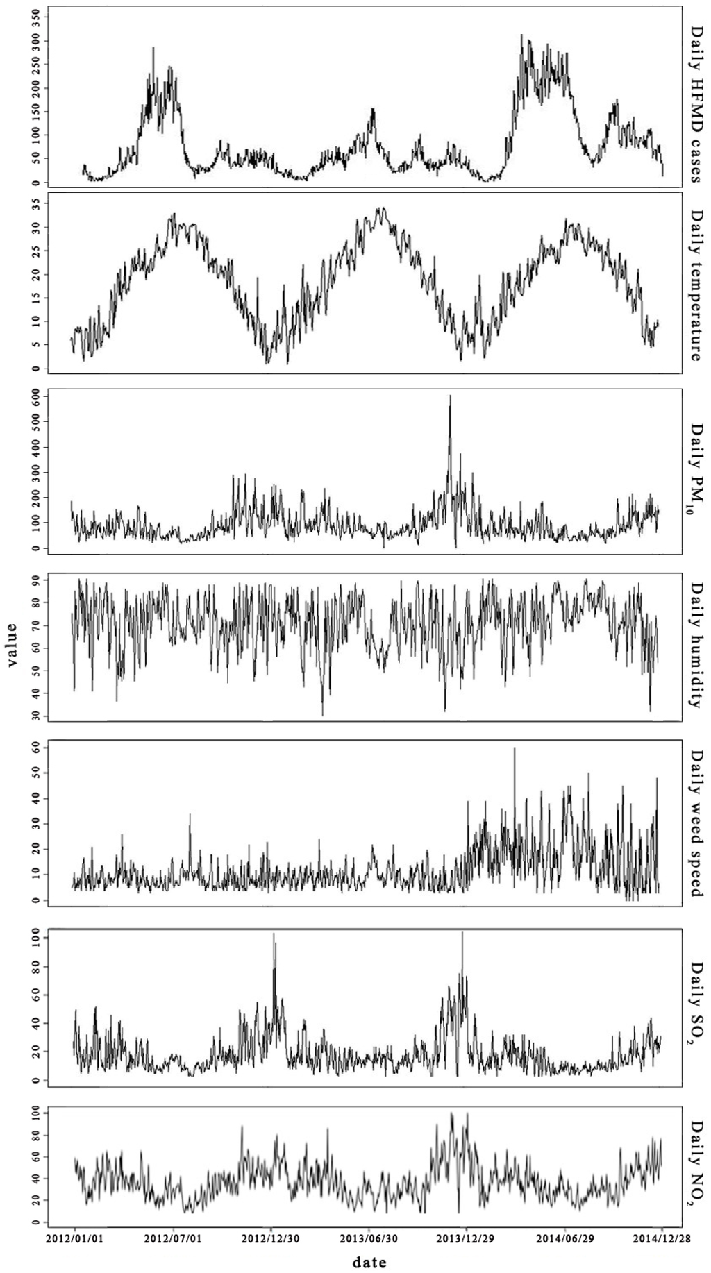 All data from HFMD cases recorded between January 2012 and December 2014 were obtained from the Ningbo Center for Disease Control and Prevention, China. The standard for the clinical diagnosis of HFMD was based on the 2009 guidelines of the Chinese Ministry of Health [18]. Daily data on mean temperature, relative humidity, wind velocity, PM10, NO2, and sulfur dioxide (SO2), the chemical compound with the formula SO2, at standard atmosphere, it is a toxic gas with a pungent, irritating smell, were obtained from the China Meteorological Data Sharing Service System. Our research team considered pediatric HFMD cases, as HFMD is a greater threat to the health of children than to that of adults.