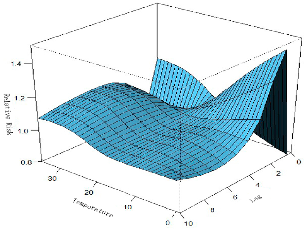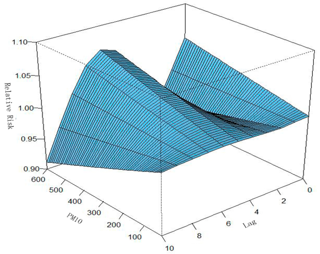 Relationships among RR, PM10, and lag days in Ningbo after adjusting for relative humidity, wind velocity, wind direction, holidays, seasonal trend, and long-term trend. A three-dimensional plot of RR, PM10, and lag days (n = 10) was generated.