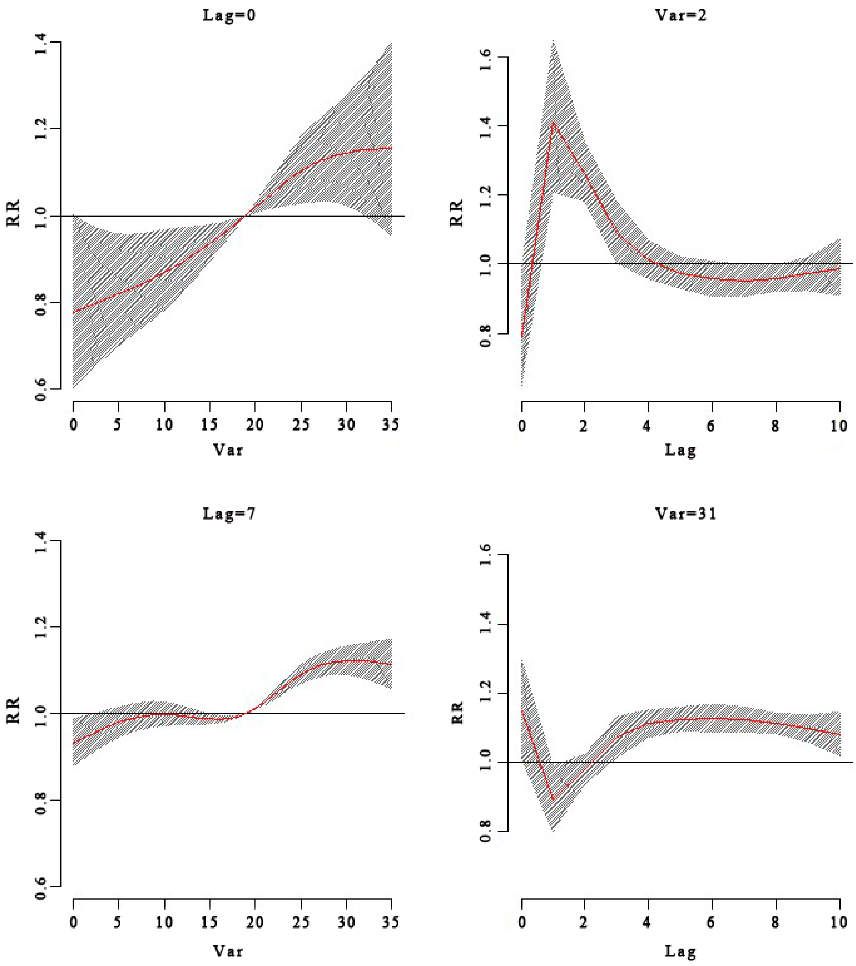 The distributed lag nonlinear model (DLNM) has been used to analyze non-linear effects and to quantify the effects of individual lags. We used this method to assess the influences of temperature and PM10 and to identify and model the log relative risks of each lag [7].