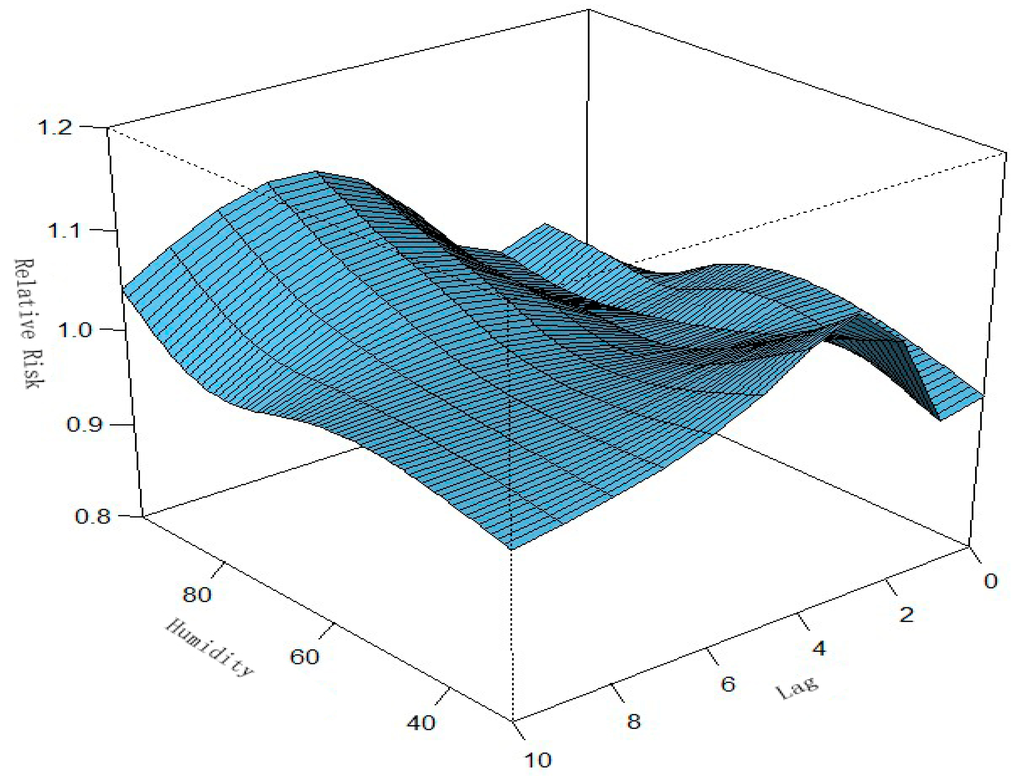 Relationships among relative risk (RR), humidity, and number of lag days in Ningbo. A three-dimensional plot of RR, humidity, and lag days (n = 10) was generated. Humidity had a nonlinear effect on the incidence of HFMD. We found that the association of humidity with HFMD may have a different lag pattern. For example, the extreme high humidity (90%) had a high RR for HFMD cases on the seventh lag day.