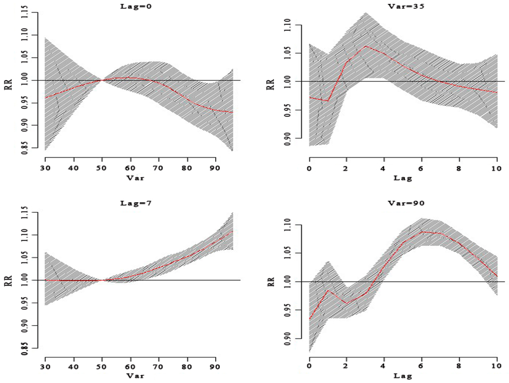 The RR of HFMD by humidity at a specific lag day (0 day, 7 day) and different humidity (35%, 90%). It shows at 90% humidity that there was high RR for HFMD cases. The relationship between the RR of HFMD and humidity had a lag effect. At 90% humidity, the RR of HFMD had a low result on the current day and then turned to an increase until the seventh lag day. When the humidity was 35%, it had a high RR of HFMD cases at the third lag day; however, when the humidity was 90%, the high RR of HFMD cases displayed at the sixth lag day.