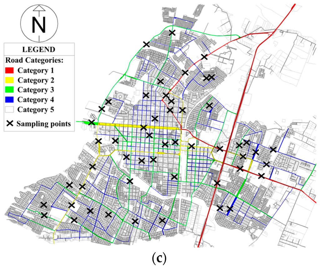 A strategy similar to the previous method was used to select the sampling points in each road category. Figure 1c shows the categorisation of different streets in the city and the locations of sampling points: eight points in Category 1, eight in Category 2, ten in Category 3, twelve in Category 4, and fourteen in Category 5.