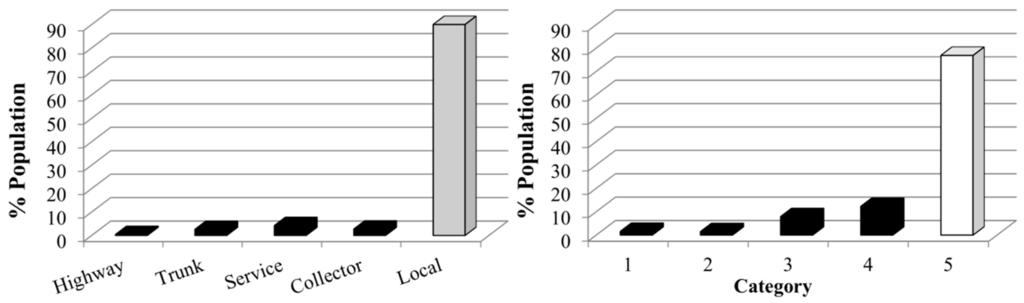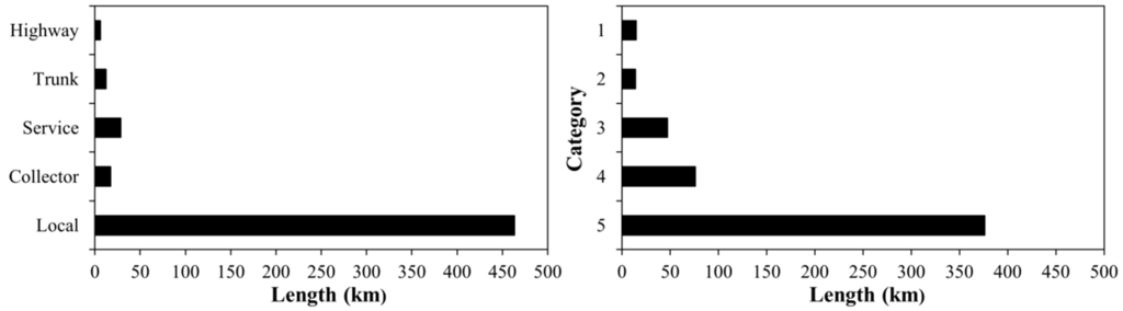 The sampling points were then randomly selected along the total length of each road type taking into account two factors. First, in the types of roads with a greater length (see Figure 2), a greater number of sampling points were selected with a minimum of eight sampling points for each road type. Second, equivalent points (those points located on the same section of a street with no important intersection between them) were discarded. For this reason, only one sampling point was selected in the highway road type. Figure 1b shows the road types and locations of the sampling points: one point in highways, eight in trunk, twelve in service, eight in collector, and twenty-three in local road types.
