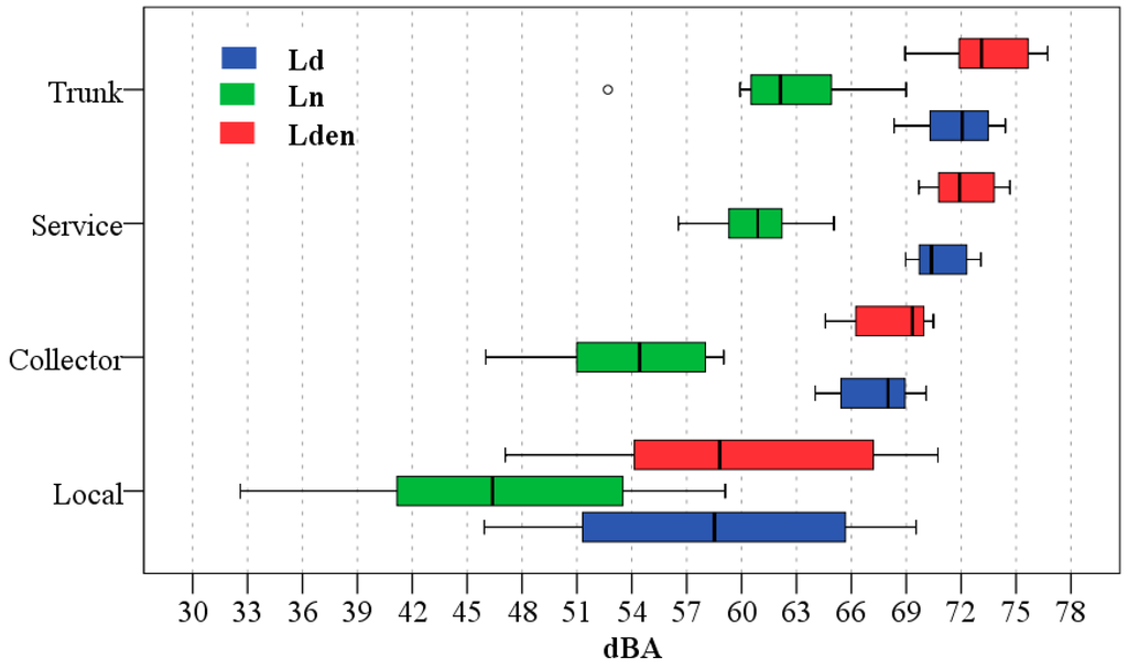 Figure 3 shows that average values of sound descriptors decrease from trunk to local road type. In highway road types, as previously indicated, only one sampling point was used. In this road type the sound values of 76.4 dB, 70.1 dB and 78.9 dB were registered for the Ld, Ln and Lden descriptors, respectively. Figure 3 also shows the analysis of the variability in mean sound levels. Trunk and service road types have an overlap of interquartile range and local road types have a high variability.
