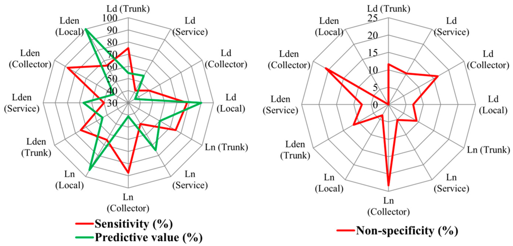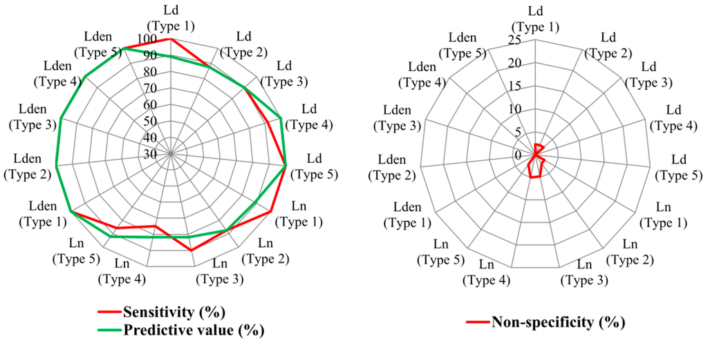 The results presented in Figure 6 show that the sensitivity of different sound descriptors is higher than 80% for all road categories (except the Ln in Category 4), and even for the Lden descriptor it is 100%. These high percentages are also obtained for the predictive value and therefore the percentages obtained in non-specificity are very low. They are lower than 5% in all sound descriptors.