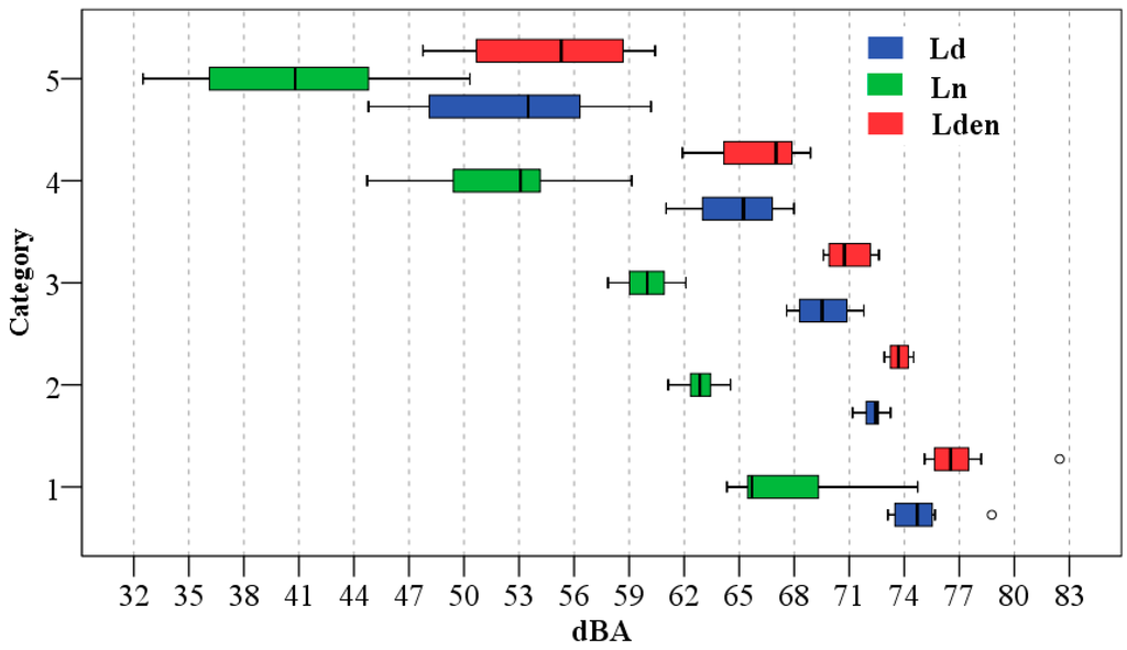 In the box plot, the interquartile ranges of the different road categories and sound descriptors have no overlaps. Category 5 has the greatest variability but it is considerably lower than that presented by the local road type.
