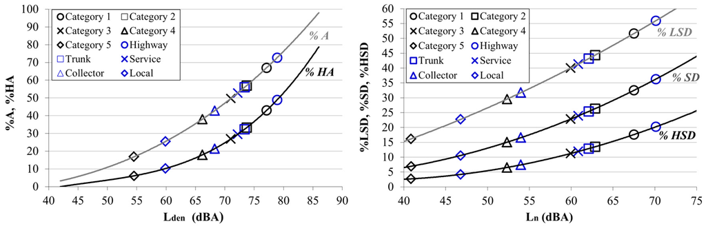 Percentages annoyance indicators (percentages of annoyed (%A) and highly annoyed (%HA) population; percentages of lowly sleep disturbed (%LSD), sleep disturbed (%SD) and highly sleep disturbed (%HSD) population) obtained from the proposed equations [58,59] for road types and road categories.