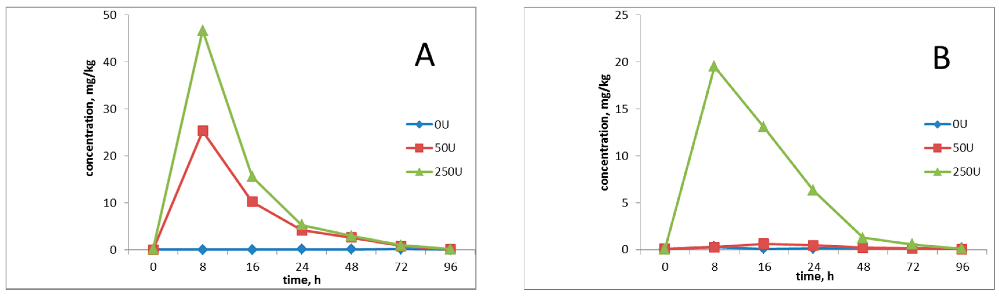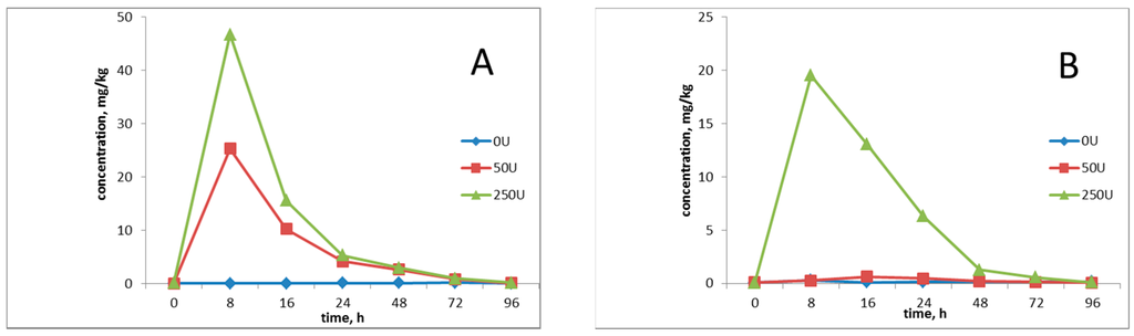 Distribution of NP in serum (A) and urine (B) in rats. NP concentrations below the limit of determination considered 0.