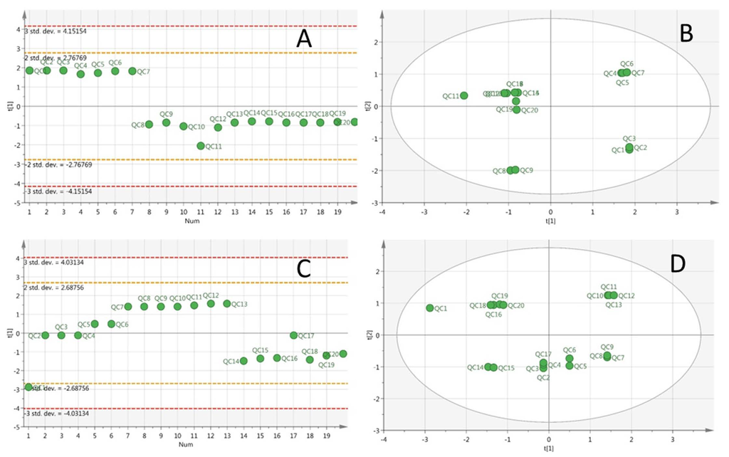 PCA of QC samples. Line plot (X-axis: run order; Y-axis: standard deviation) in positive ion mode (A); score plot (cycle represents 95% confidence interval) in positive ion mode (B); line plot in negative ion mode (C); and score plot in negative ion mode (D).