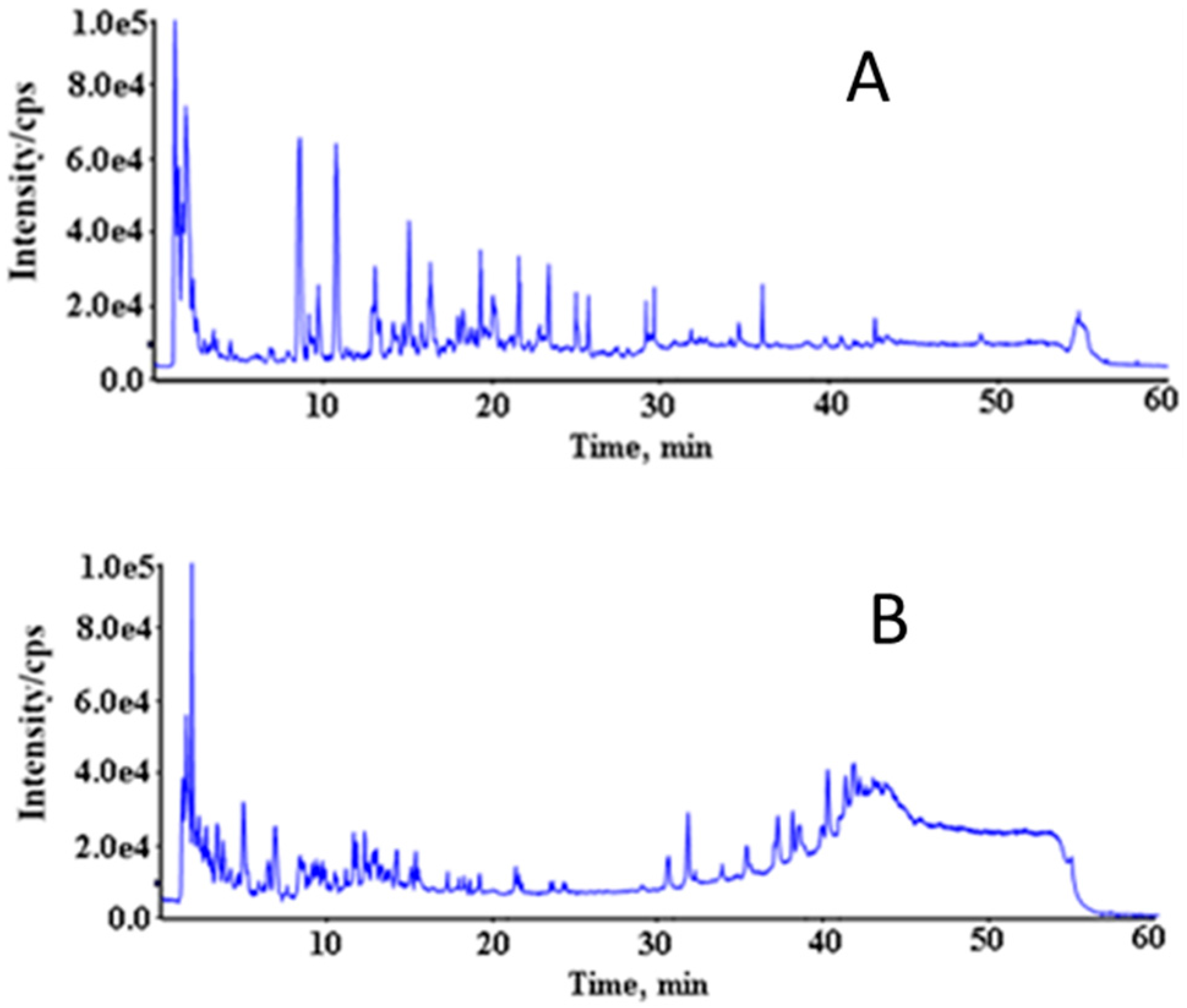 Typical chromatograms—total ion chromatogram (TIC) of a rat’s urine sample by LC-QTOF-MS, in positive ion mode (A) and negative ion mode (B).