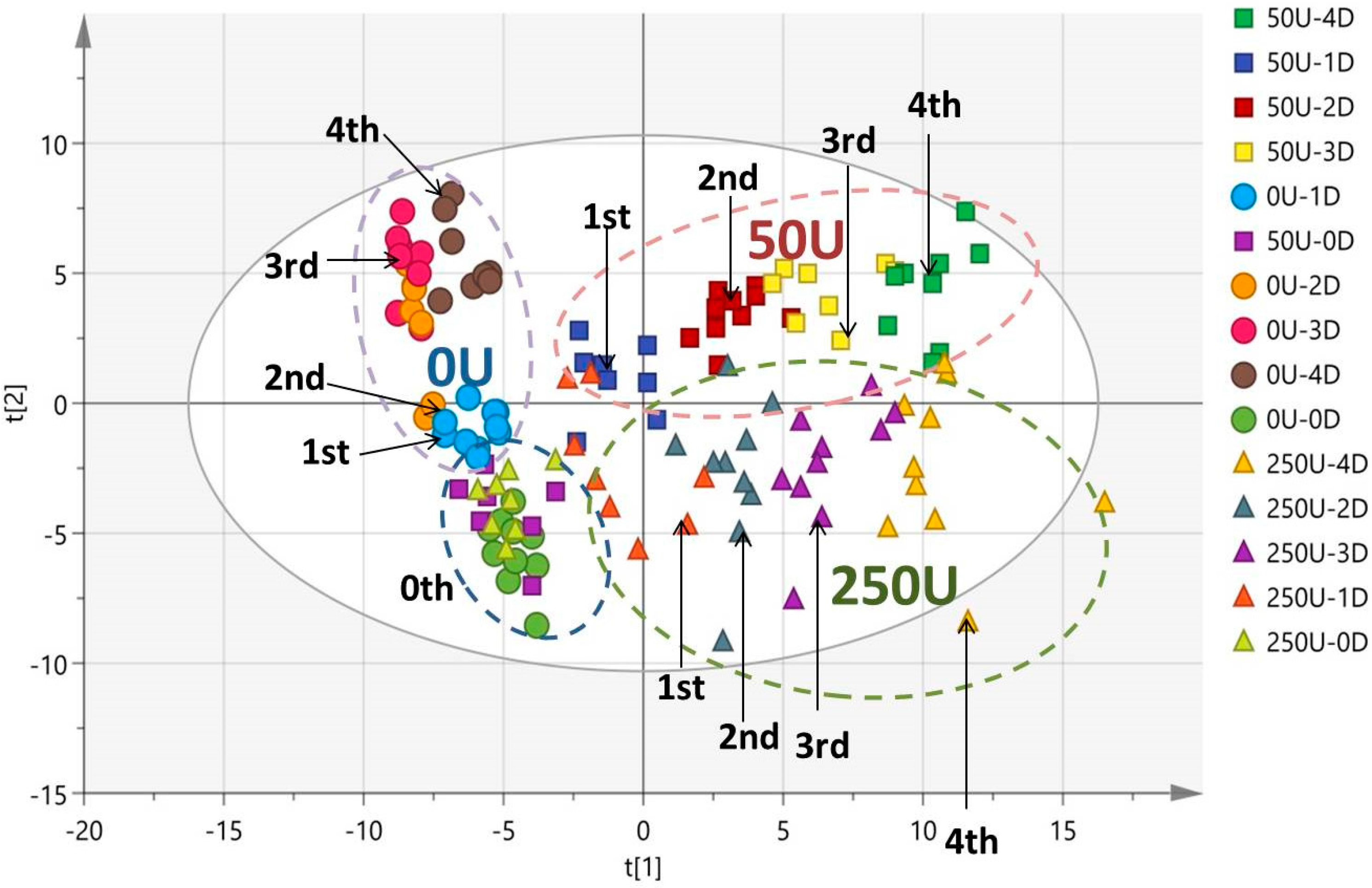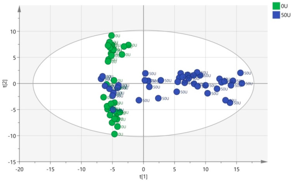 The correlations between variables and components were determined, as shown in Figure S1. In the OPLS-DA model, there were more than 48 variables considered important (VIP > 1) (VIP means variable importance in projection values), among which 20 variables were considerably different between the 0- and 50-unit group (t test; p < 0.05). The ions and their p-values were given in Table S1.