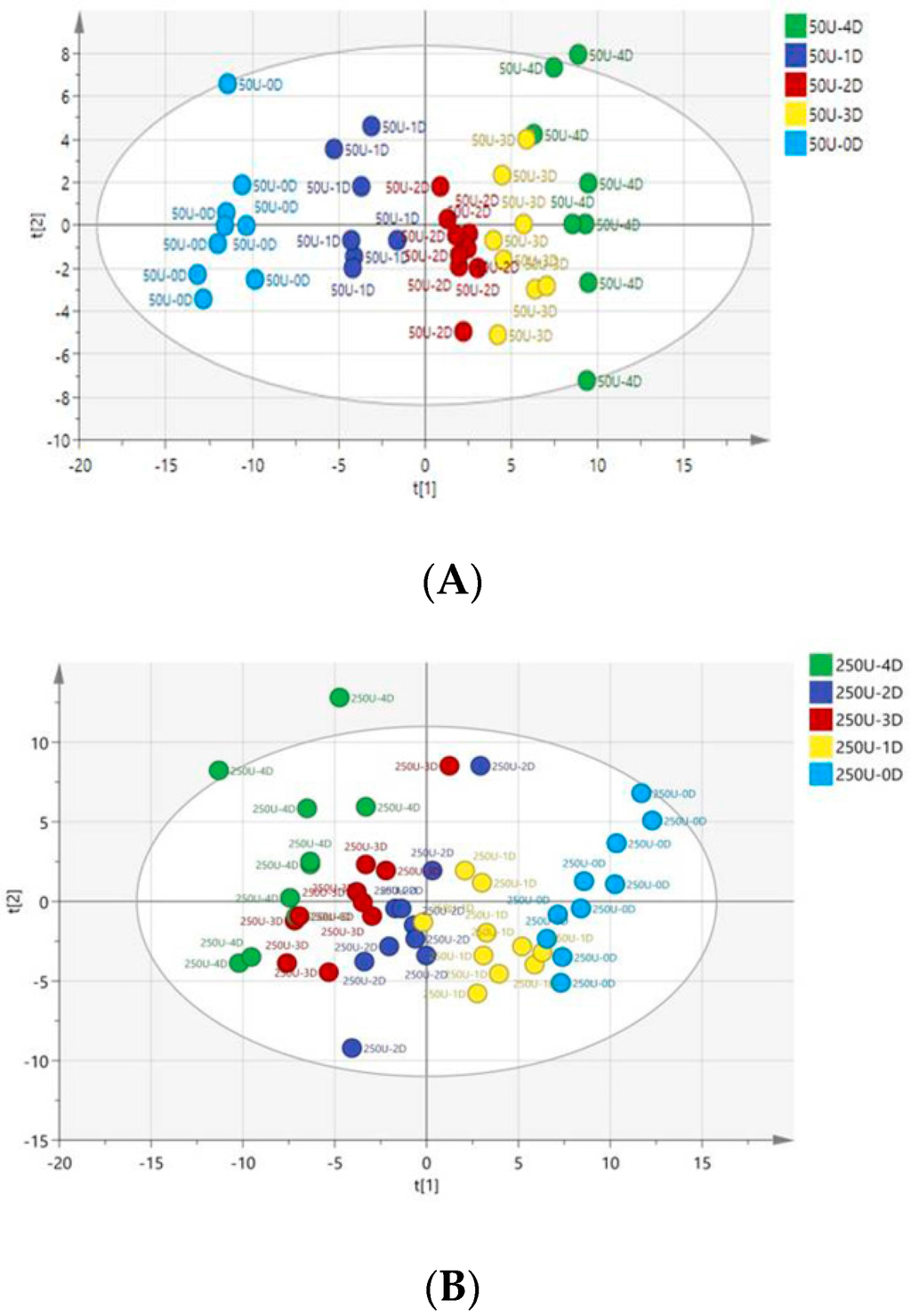 Score plot of OPLS-DA obtained based on the urine samples from the 50-unit group (A) and 250-unit group (B).