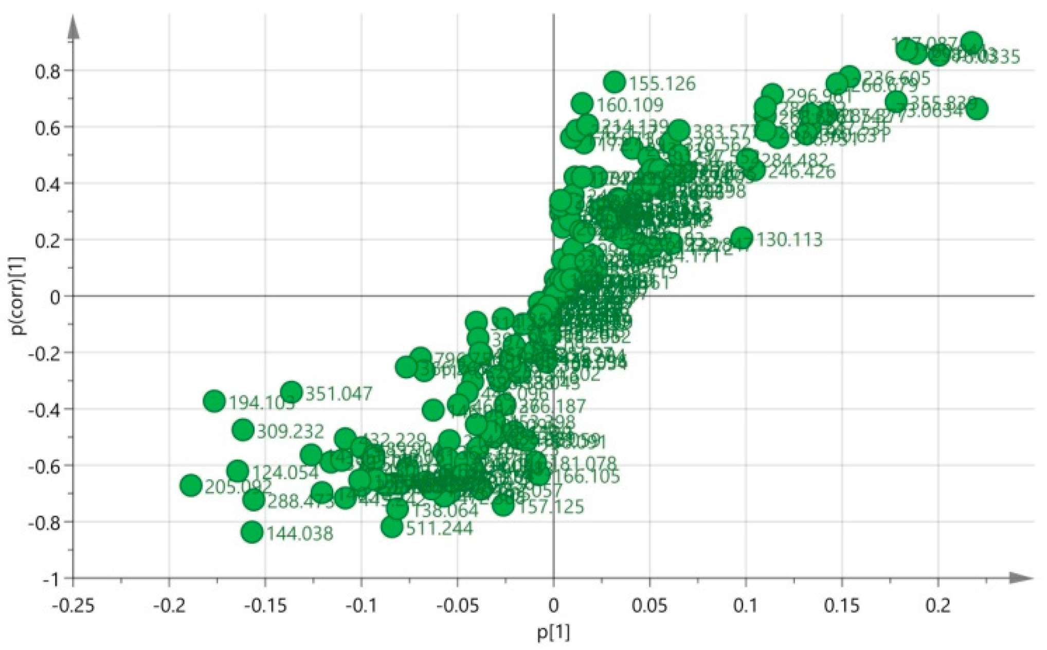 The loading plot (S-plot) of OPLS-DA for the 0 unit vs. 50 units.