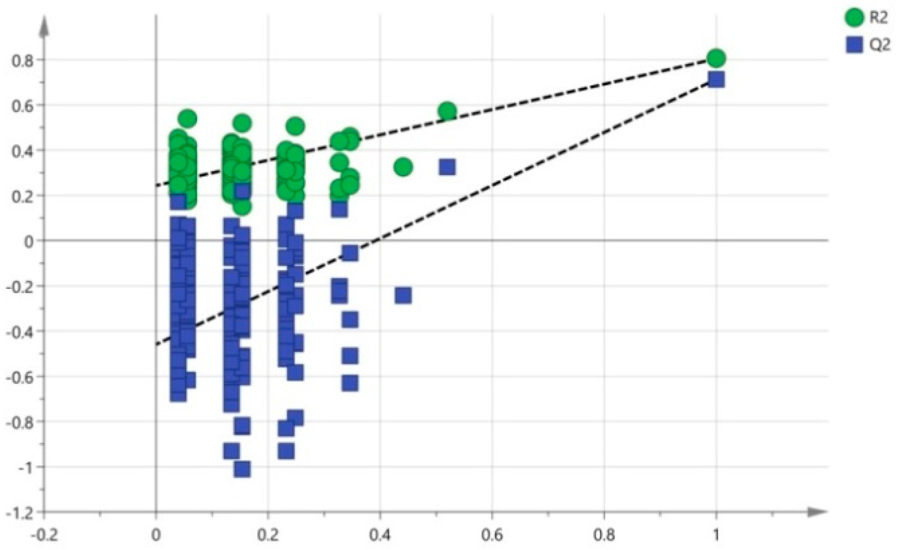 The model (R2X = 0.286, R2Y = 0.783, and Q2 = 0.702) was highlighted as an excellent high-quality model, which properly classified all samples. The results demonstrated that 28.6% of the variables (R2X) could be used to explain 78.3% of the variations between the exposure group and the control group (R2Y). The results of projection validity indicated that the average prediction capability (Q2) was 70.2%. The difference between R2Y and Q2 was less than 0.2 and the Q2 value was greater than 50%, revealing an excellent predictive capability [30]. A 200-time permutation test was conducted to further validate the established model. The goodness-of-fit (R2) and predictive capability (Q2) of the unmodified model were then demonstrated (Figure 8). The acquired R2Y (green circle) and R2Y of the actual model formed a regression line with an intercept of 0.115, which was theoretically required to be less than or equal to 0.3. The Q2 (blue box) and Q2 of the actual model formed a regression line with an intercept of −0.705, which was required to be no greater than 0.05 in theory. The obtained values met the critical value requirements. The validity test results indicated that the mass spectrometric data matrix obtained from batches of urine samples had established a reliable identification model after the above treatment, which could be used for later differential variable acquisition.