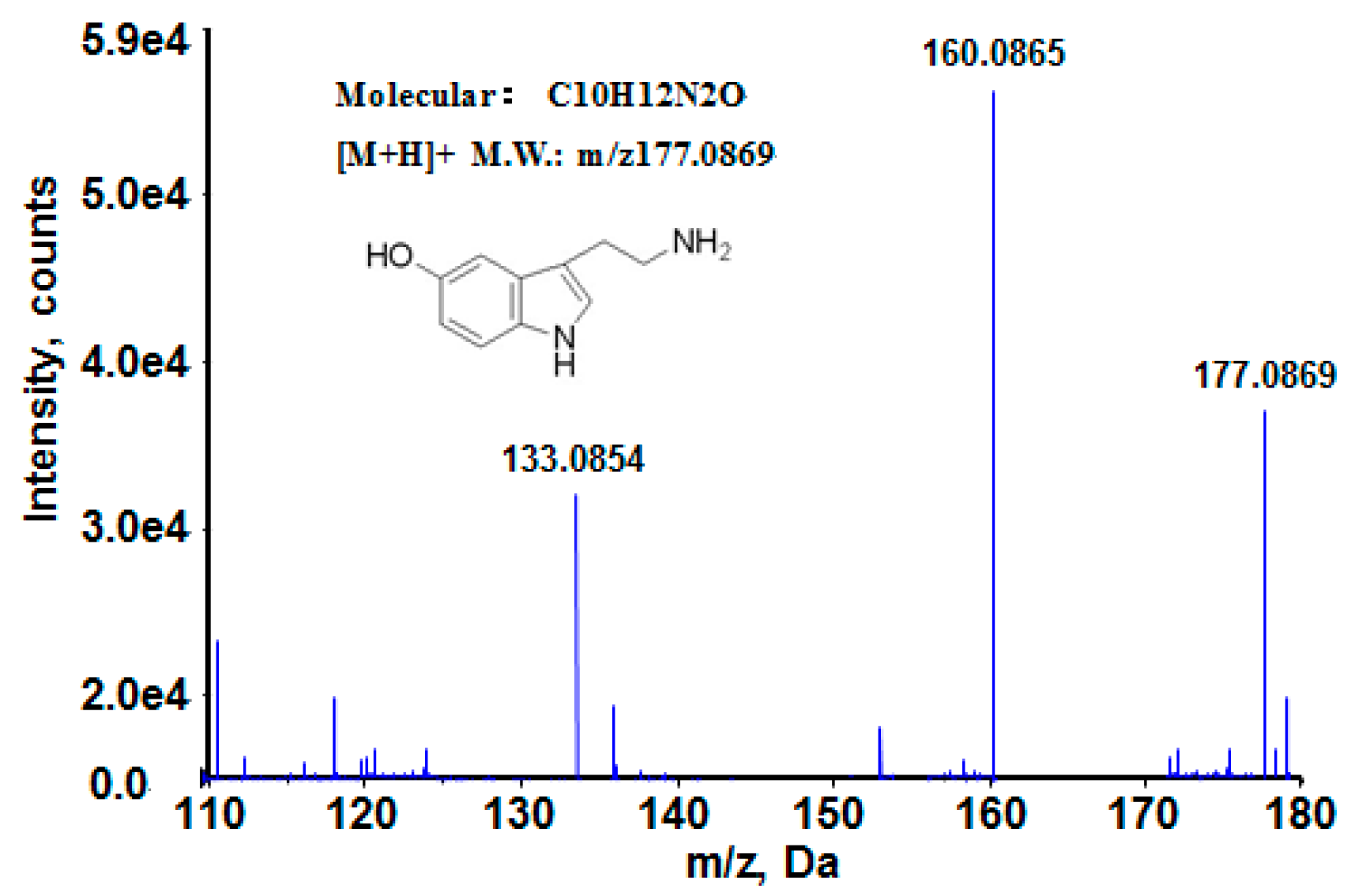 The metabolite identification procedure was described using 5-hydroxy-tryptamine as an example. The structure of 5-hydroxy-tryptamine is 3-(2-aminoethyl)-5-oxyindole (Figure 9), which has the retention time of 12.6 min in mass spectrometry, where the [M + H]+ molecular ion was at m/z 177.0869. Figure 9 shows the high-resolution LC-MS/MS spectrum of the metabolite, which indicates that the isotopic peak of the metabolite [M + H]+ ion is extremely low, implying S is not included in the compound. According to the preceding conditions and accurate mass value of the molecular ion, the molecular formula in Analyst QS 2.0 was used to calculate possible compositions, and the only possible element obtained was C10H13N2O+, by which the metabolite was inferred as 5-hydroxy-tryptamine. The product ions in the MS/MS spectrum could all be reasonably elucidated. The m/z 160.0865 was produced from the [M + H]+ ion by discarding an NH3 molecule, while the m/z 133.0854 was generated from the [M + H]+ ion with the loss of 44.0025 Da, which should result in CH2CH2NH2. This is because 5-hydroxy-tryptamine is easily broken to form a stable 5-membered ring. After the comparison with 5-hydroxy-tryptamine standards in the MS/MS spectra, the possible biomarker’s structure was finally determined as 5-hydroxy-tryptamine. This method was conducted to identify other metabolites with a similar flow.