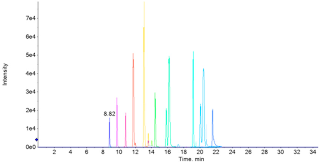The typical XICs of the HPLC-MS/MS MRM mode analysis in potential biomarkers.