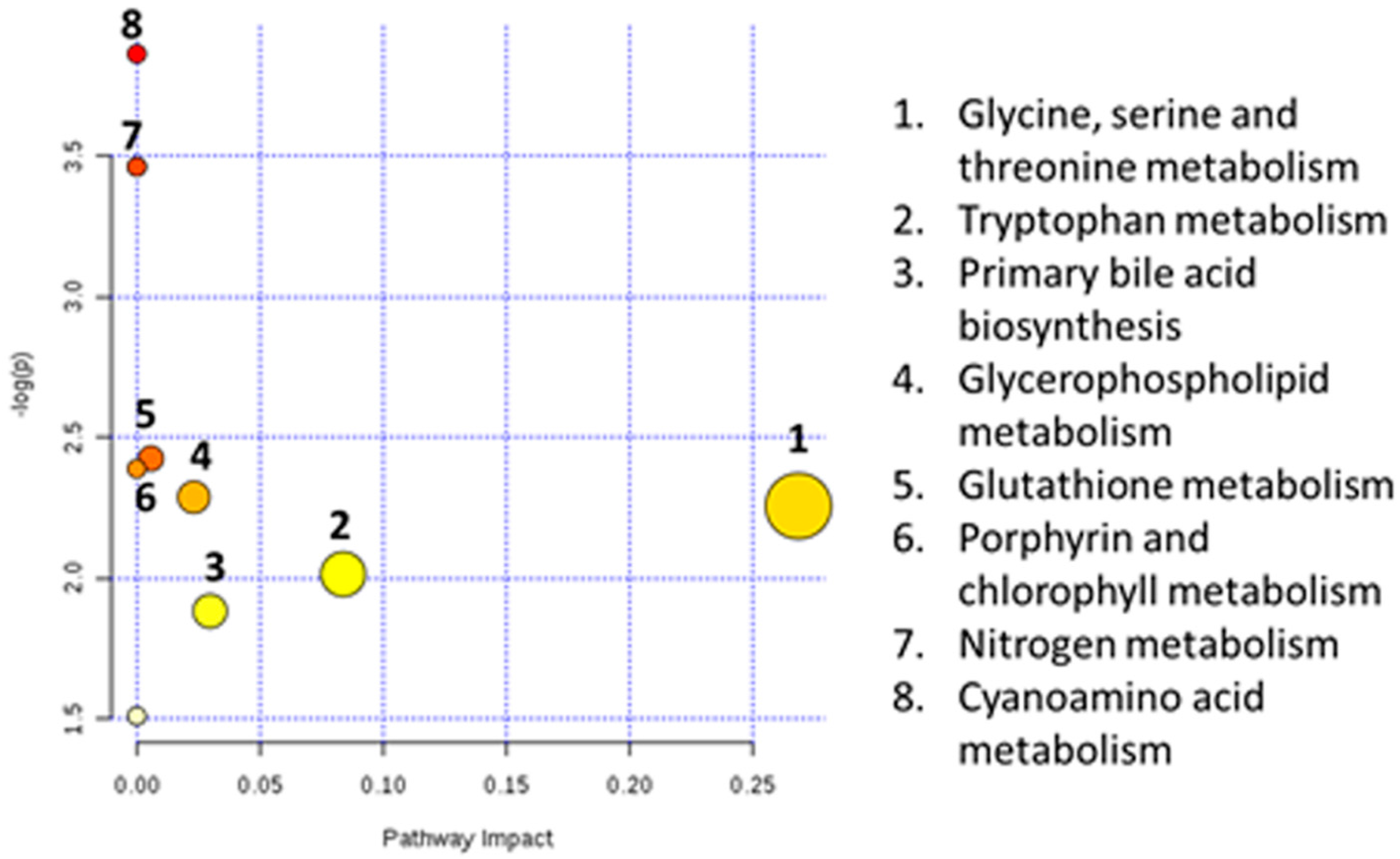 According to an investigation, the structure of NP is similar to 17β-estradiol (E2), and NP can compete to inhibit the combination of E2 with the estrogen receptor (ER) of the target organ [44,45]. It has been reported that E2 could increase the 5-HT level in the nervous system by inhibiting the MAO activity [8,46]. The MAO dysfunction is considered to be associated with nervous system diseases [47]. In this study, NP was considered as a type of environmental estrogen and simulated the function of E2 to suppress the MAO activity in the rats’ bodies so that 5-HT accumulated to a high level due to the interruption of decomposition and metabolism. As a result, the nervous system of the organism was injured. The metabolic pathways affected by NP exposure are shown in Figure 11. MetaboAnalyst was used to analyze the metabolic pathways affected by NP exposure. In Figure 11, the term “log (P)” on the Y axis is the transformation of the original p value calculated from the enrichment analysis; the term “Impact” on the X axis is the pathway impact value calculated from the pathway topology analysis. The bubble area is proportional to the impact of each pathway, with different colors denoting the significance from the highest in red to the lowest in white.