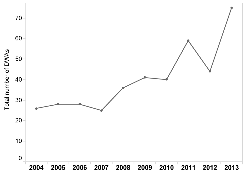 Annual trends in DWAs in First Nations drinking water systems in Ontario, 2004–2013.
