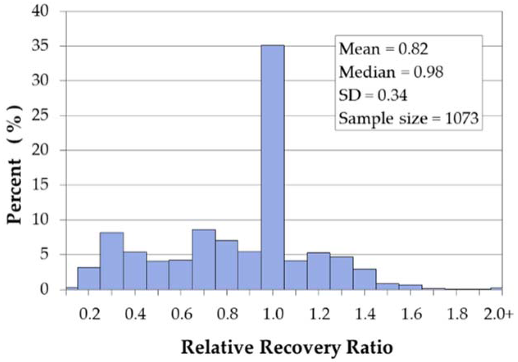 Table 5 includes the descriptive statistics for the relative recovery ratio (Equation (1)). The range of the RRR has a minimum of 0.09 and a maximum of 2.02. In other words, at least one homeowner received 9% of the property value in federal dollars, while another homeowner received more than twice the federal dollars than the total value of their home (202%). Table 5 excludes outliers based on the labeling rule for outliers [61,62]. The results of the labeling rule estimated an upper bound of RRR 2.2, so five acquisitions with RRR values ranging from 2.4 to 11.0 were excluded from the analysis. The remaining properties, with RRR between 0.09 and 2.02, have dollar amounts ranging from $3,000 to $970,000.