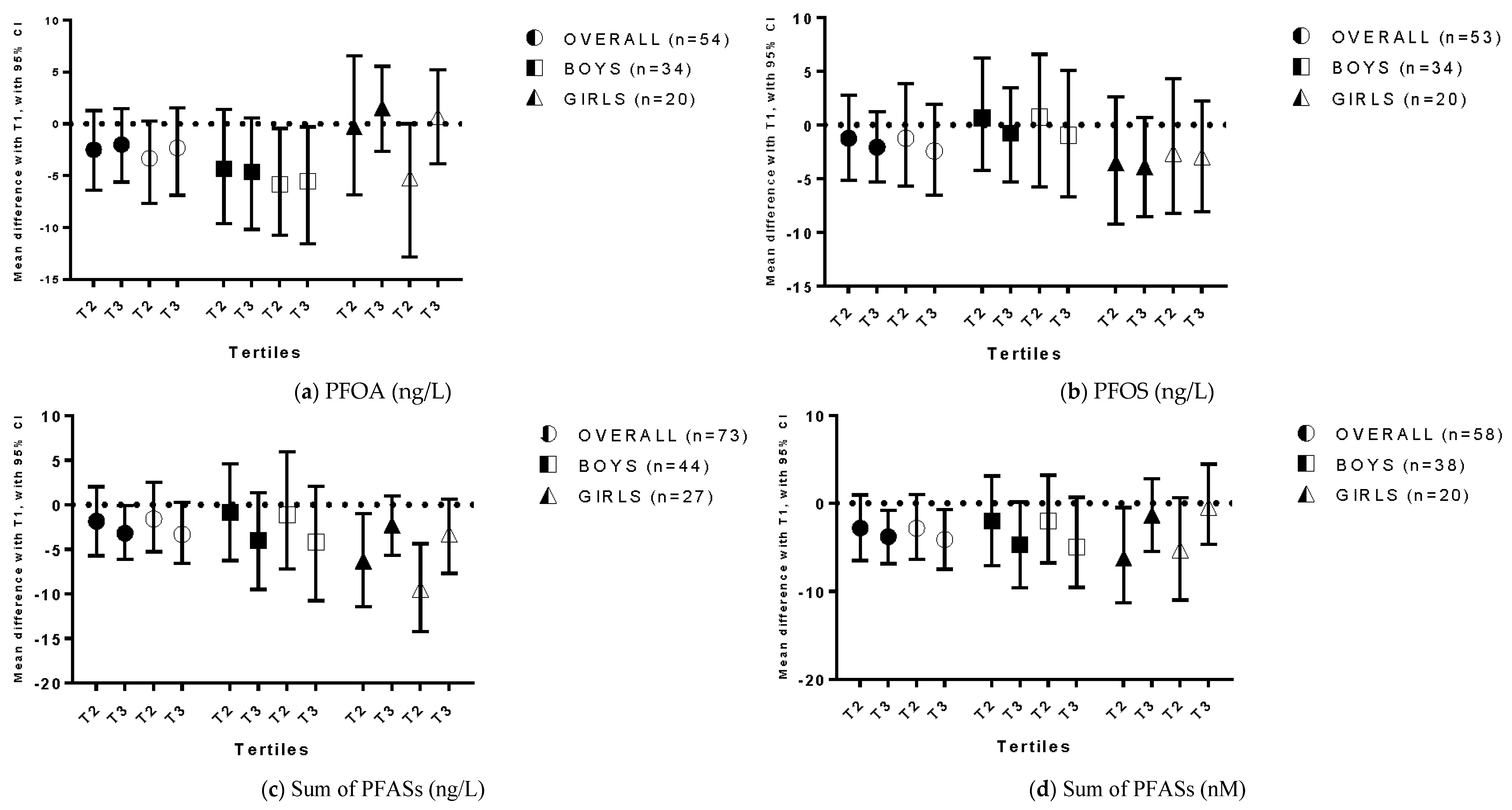 Exposure to perfluoroalkyl substances and scores on the Externalizing Behavior Scale of the Child Behavior Checklist 1.5–5. (a) PFOA (ng/L); (b) PFOS (ng/L); (c) Sum of PFASs (ng/L); (d) Sum of PFASs (nM). The mean difference in ADHD scores between tertiles of exposure is reported, with T1 as a reference category. Filled symbols represent results from crude analyses, while empty symbols represent results from adjusted analyses.