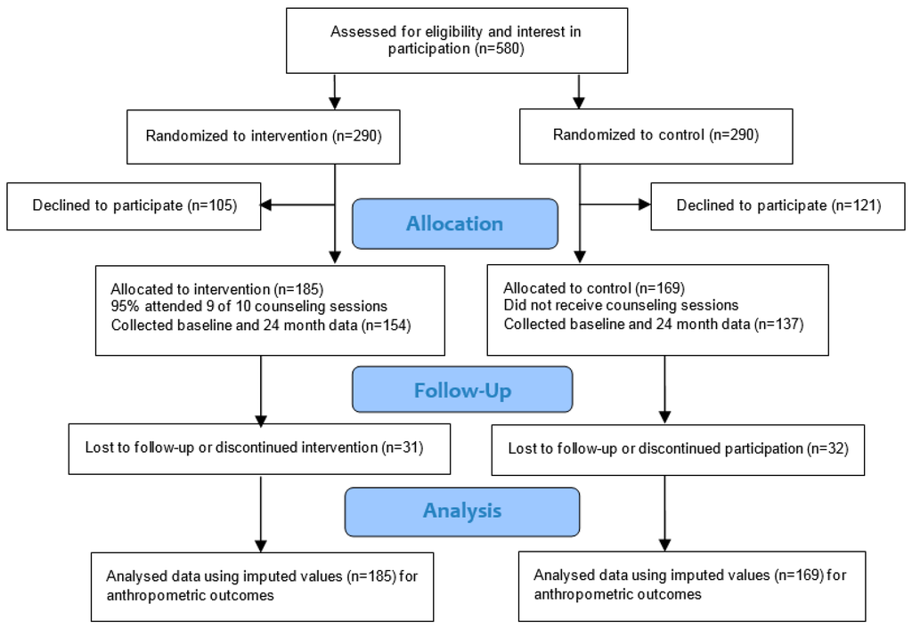 | Anthropometric Variable | Baseline | 6 Months | 12 Months | 18 Months | 24 Months | Mean Difference (95% CI) Intervention and Control b | Overall Mixed Effect p Value | |||||