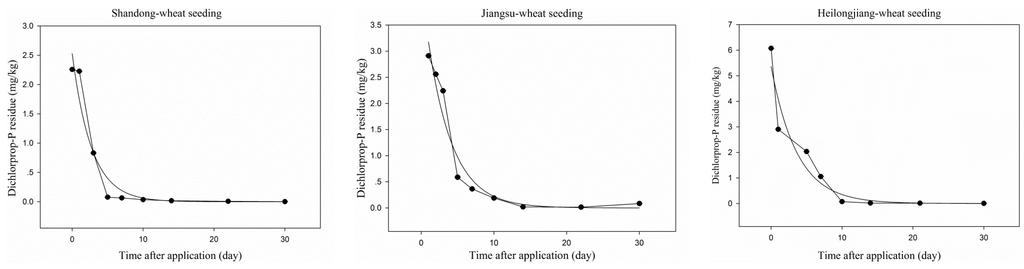 Figure 3. Dissipation of dichlorprop-P in wheat plants in Shandong, Jiangsu and Heilongjiang.